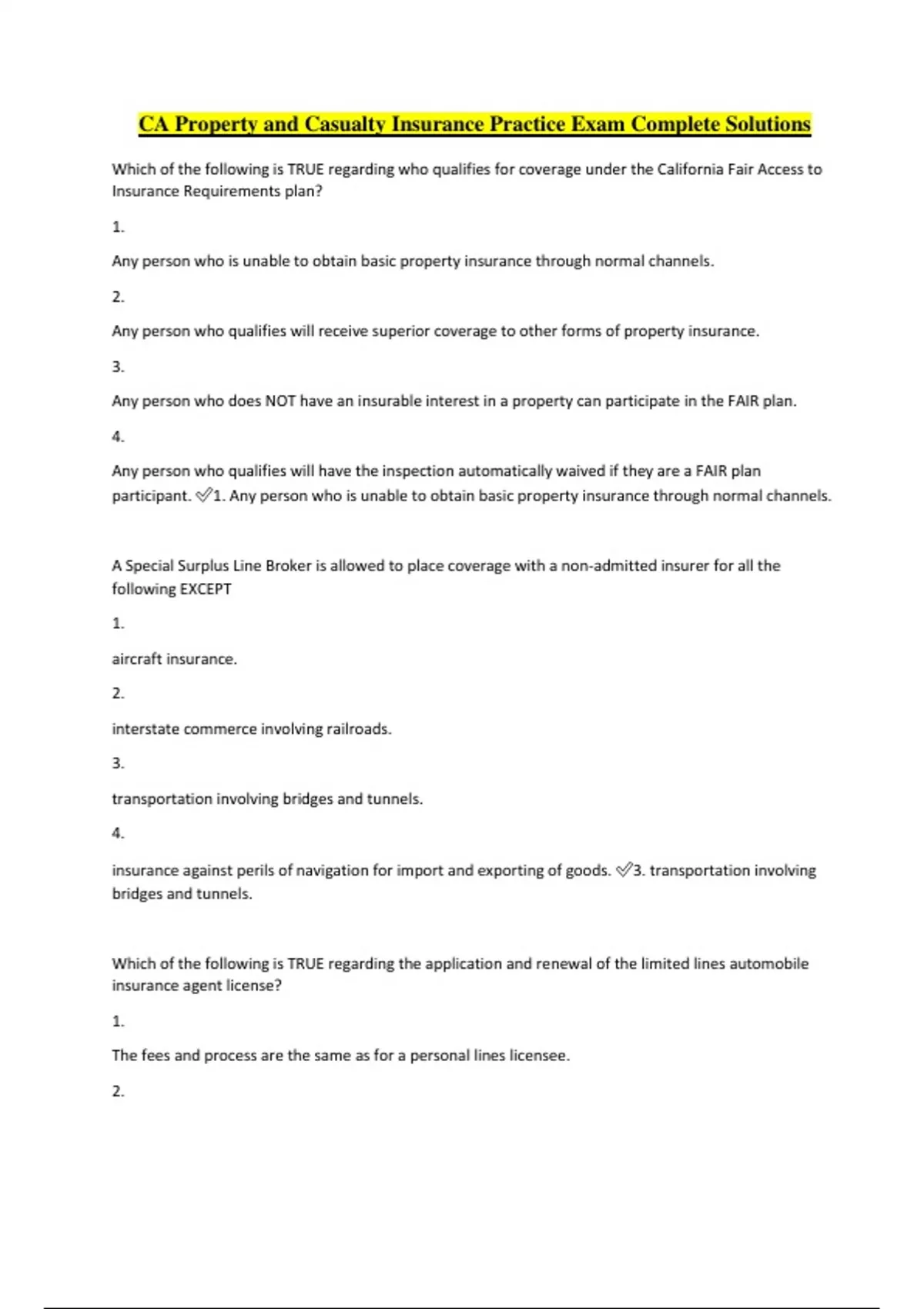 CA Property and Casualty Insurance Practice Exam Complete Solutions Which of the following is TRUE regarding who qualifies for coverage under the California Fair Access to Insurance Requirements plan? 1. Any person who is unable to obtain basic property insurance through normal channels. 2. Any person who qualifies will receive superior coverage to other forms of property insurance. 3. Any person who does NOT have an insurable interest in a property can participate in the FAIR plan. 4. Any person who qualifies will have the inspection automatically waived if they are a FAIR plan participant. 1. Any person who is unable to obtain basic property insurance through normal channels. A Special Surplus Line Broker is allowed to place coverage with a non-admitted insurer for all the following EXCEPT 1. aircraft insurance. 2. interstate commerce involving railroads. 3. transportation involving bridges and tunnels. 4. insurance against perils of navigation for import and exporting of goods. 3. transportation involving bridges and tunnels. Which of the following is TRUE regarding the application and renewal of the limited lines automobile insurance agent license? 1. The fees and process are the same as for a personal lines licensee. 2. There are no fees for filing the application or renewal applications for the license. 3. The limited lines agent is ineligible to become a property or casualty broker-agent. 4. The agent must pass an examination on the insurance code and products, but not ethics. 1. The fees and process are the same as for a personal lines licensee. Which of the following is TRUE regarding continuing education requirements of an agent or broker? 1. Any licensee shall satisfactorily complete 24 hours of instruction prior to license renewal. 2. Any licensee in good standing for 10 years may apply for exemption to the continuing education requirement if reputation has been proven. 3. An agent or broker licensed in life and health requires more continuing education hours than an agent or broker licensed in property and casualty. 4. A licensee who is 65 years or older shall be exempt from continuing education hours if reputation of agent or broker is in good standing for 25 years. 1. Any licensee shall satisfactorily complete 24 hours of instruction prior to license renewal. Which is an ACCURATE statement regarding the List of Approved Surplus Lines Insurers? 1. Participation in LASLI is mandatory and all approved non admitted insurers are on the list. 2. Surplus lines insurers that are not on the list are unapproved for broker use. 3. The same rules apply for U.S. domiciled and non U.S. domiciled carriers. 4. Eligible carriers do not need to file documents with the California Department of Insurance. 4. Eligible carriers do not need to file documents with the California Department of Insurance. What 2 different types of areas are served by the California Fair Access to Insurance Responsibilities