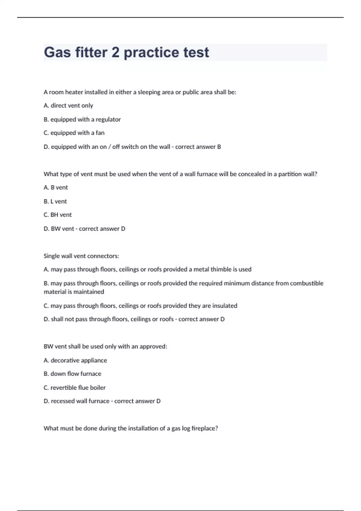 Gas Fitter 2 Final Exam Practice Test 2024. A room heater installed in either a sleeping area or public area shall be: A. direct vent only B. equipped with a regulator C. equipped with a fan D. equipped with an on / off switch on the wall - correct answer B What type of vent must be used when the vent of a wall furnace will be concealed in a partition wall? A. B vent B. L vent C. BH vent D. BW vent - correct answer D Single wall vent connectors: A. may pass through floors, ceilings or roofs provided a metal thimble is used B. may pass through floors, ceilings or roofs provided the required minimum distance from combustible material is maintained C. may pass through floors, ceilings or roofs provided they are insulated D. shall not pass through floors, ceilings or roofs - correct answer D BW vent shall be used only with an approved: A. decorative appliance B. down flow furnace C. revertible flue boiler D. recessed wall furnace - correct answer D What must be done during the installation of a gas log fireplace?
