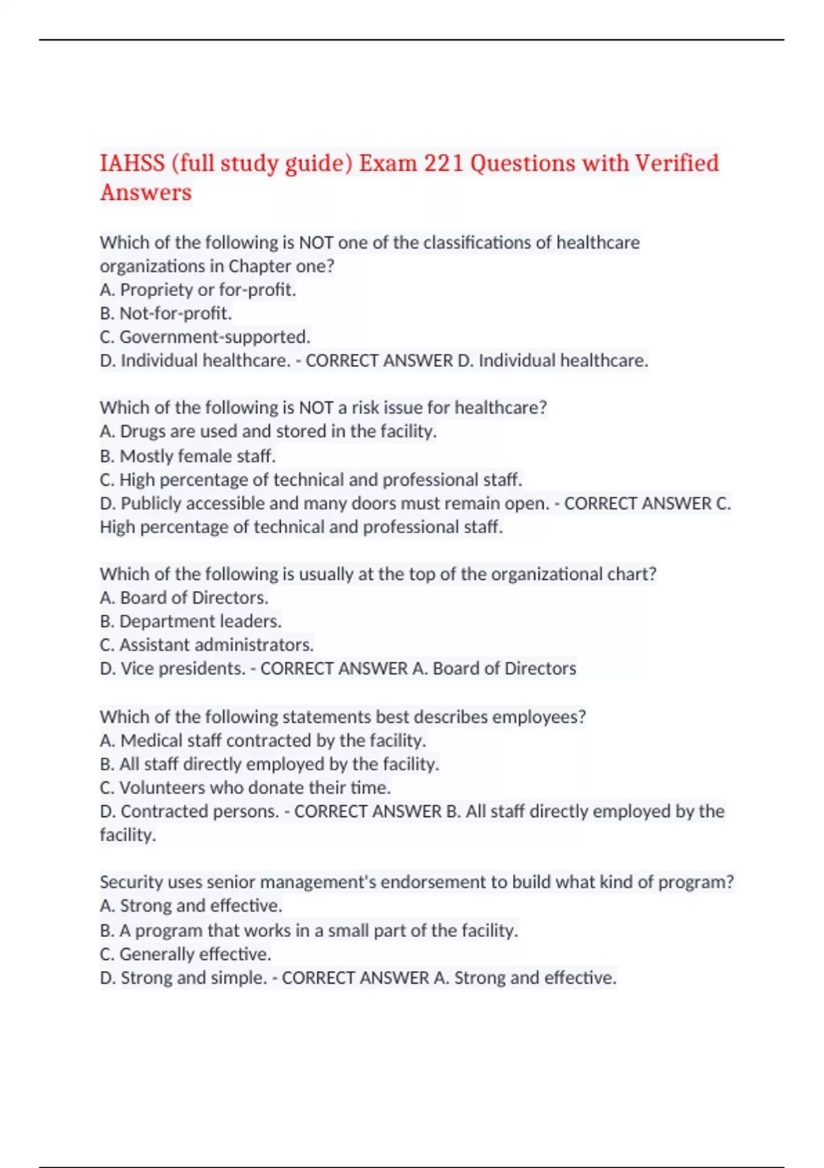 IAHSS (full study guide) Exam 221 Questions with Verified Answers Which of the following is NOT one of the classifications of healthcare organizations in Chapter one? A. Propriety or for-profit. B. Not-for-profit. C. Government-supported. D. Individual healthcare. - CORRECT ANSWER D. Individual healthcare. Which of the following is NOT a risk issue for healthcare? A. Drugs are used and stored in the facility. B. Mostly female staff. C. High percentage of technical and professional staff. D. Publicly accessible and many doors must remain open. - CORRECT ANSWER C. High percentage of technical and professional staff. Which of the following is usually at the top of the organizational chart? A. Board of Directors. B. Department leaders. C. Assistant administrators. D. Vice presidents. - CORRECT ANSWER A. Board of Directors Which of the following statements best describes employees? A. Medical staff contracted by the facility. B. All staff directly employed by the facility. C. Volunteers who donate their time. D. Contracted persons. - CORRECT ANSWER B. All staff directly employed by the facility. Security uses senior management's endorsement to build what kind of program? A. Strong and effective. B. A program that works in a small part of the facility. C. Generally effective. D. Strong and simple. - CORRECT ANSWER A. Strong and effective. How should friendships and inter-personal relationships between security officers and staff members from other departments be treated? A. Discouraged. B. Encouraged. C. Encouraged but monitored. D. Encouraged, but security staff educated about ethics and avoiding favoritism. - CORRECT ANSWER D. Encouraged, but security staff educated about ethics and avoiding favoritism. Which of the following allows a department to assess its cost-effectiveness within an organization? A. Crime analysis. B. Risk assessments. C. Bench-marking. D. Evaluation surveys. - CORRECT ANSWER C. Bench-marking. What should the most primary overriding concern of any security department be? A. Its image. B. The safety and well-being of anyone in the facility. C. The goals and mission of the entity employing the security services. D. Cost-effectiveness. - CORRECT ANSWER B. The safety and well-being of anyone in the facility. Which of the following are skills a security professional should have and use at all times? A. Good observation skills. B. good communication skills. C. Tolerance. D. All of the above. - CORRECT ANSWER D. All of the above. Why are vendors potentially a high security risk to a healthcare facility? A. Vendors often have access to sensitive areas yet staff of the healthcare organization may know very little about vendor's background. B. Vendors typically drive large vehicles that can conceal large amounts of stolen property or contraband. C. Competing vendors may clash at a facility. D. Vendors may be bringing in high-demand products that could be targeted for theft. - CORRECT ANSWER A. Vendors often have access to sensitive areas yet staff of the healthcare organization may know very little about vendor's background. In the patient- and family-centered care philosophy, who determines which individuals are part of the patient's family? A. Patient's parents or legal guardians. B. Nursing staff. C. Attending physician. D. The patient, provided he or she is developmentally mature and competent to do so. - CORRECT ANSWER D. The patient, provided he or she is developmentally mature and competent to do so. Which of the following is not an example of an external costumer? A. Patients. B. Vendors. C. Employees. D. Regulatory agencies. - CORRECT ANSWER C. Employees. Which of the following does NOT help the security uniform communicate an appropriate message to the public? A. Clean uniform. B. Wearing the uniform shirt outside of the trousers. C. Well cared for uniform. D. Shined footwear. - CORRECT ANSWER B. Wearing the uniform shirt outside of the trousers. Which of the following is NOT an example of undesirable behavior and demeanor in a security officer? A. Bad attitude. B. Dishonesty. C. Impoliteness. D. Confidence. - CORRECT ANSWER D. Confidence. What is the relationship between employees and management sometimes called? A. Employee relations. B. Confidentiality. C. Family interaction. D. Tense conversation. - CORRECT ANSWER A. Employee relations. Which of the following may union members NOT do during picketing? A. Carry signs. B. Protest management decisions. C. Block entrances to the building. D. Congregate outside the facility. - CORRECT ANSWER C. Block entrances to the building. Which of the following is NOT a true statement about customers' perceptions of their experience? A. Interaction is subject to personal interpretation. B. Interaction can only be perceived by words stated. C. Interaction is affected by body language. D. Interaction is affected by all of your actions. - CORRECT ANSWER B. Interaction can only be perceived by words stated. Which of the following is NOT one of the three powerful, personal reasons to provide great customer service? A. More job satisfaction. B. Less stress and hassle. C. Trying to impress your supervisor. D. More job success. - CORRECT ANSWER C. Trying to impress your supervisor. Which of the following describes the main objective of good customer service? A. To make the customer walk away with a positive feeling. B. To help the customer see that someone tried, even though though the customer,s wants were not met. C. To make the customer think no one cares about the concern raised by the customer. D. To help the customer walk away with a neutral feeling. - CORRECT ANSWER A. To make the customer walk away with a positive feeling. Which of the following is the definition of a customer? A. External paying customer. B. Internal customer. C. Non-paying external customer. D. Anyone with whom you interact. - CORRECT ANSWER D. Anyone with whom you interact. Which of the following is NOT a common technique to use while providing good customer serv