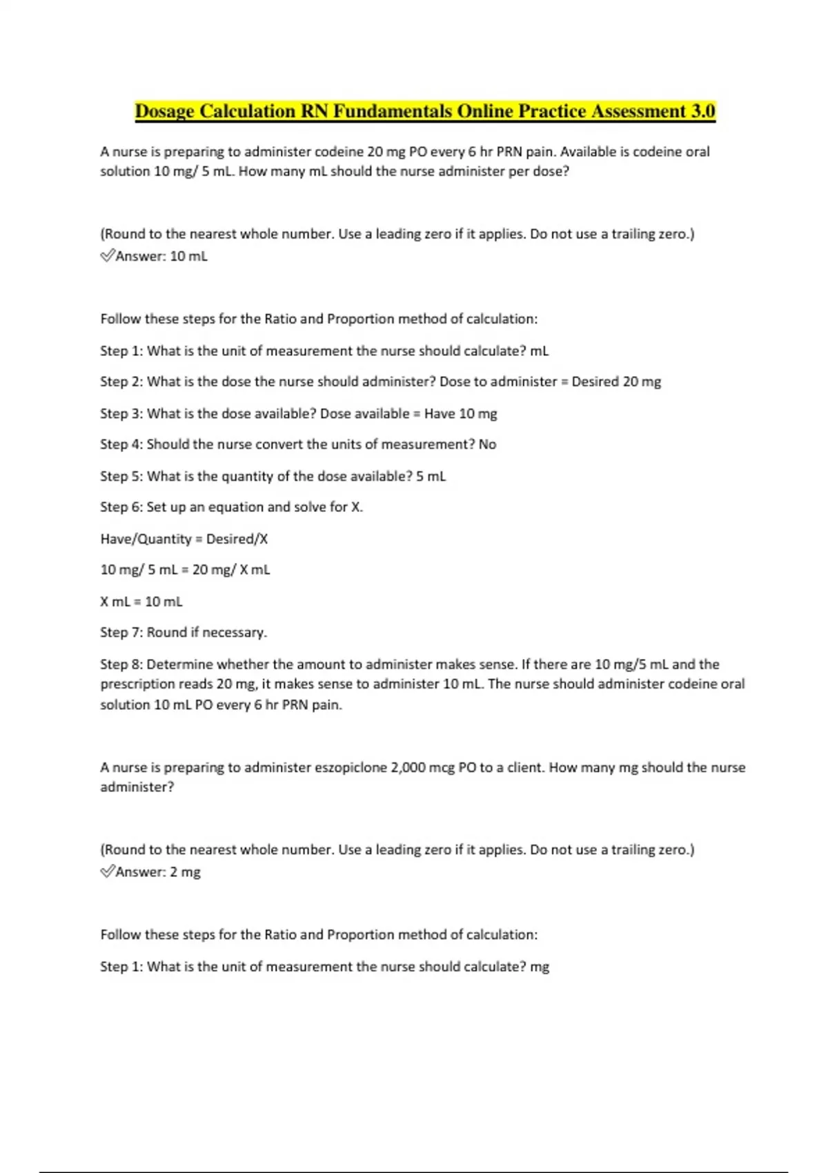 Dosage Calculation RN Fundamentals Online Practice Assessment 3.0 A nurse is preparing to administer codeine 20 mg PO every 6 hr PRN pain. Available is codeine oral solution 10 mg/ 5 mL. How many mL should the nurse administer per dose? (Round to the nearest whole number. Use a leading zero if it applies. Do not use a trailing zero.) Answer: 10 mL Follow these steps for the Ratio and Proportion method of calculation: Step 1: What is the unit of measurement the nurse should calculate? mL Step 2: What is the dose the nurse should administer? Dose to administer = Desired 20 mg Step 3: What is the dose available? Dose available = Have 10 mg Step 4: Should the nurse convert the units of measurement? No Step 5: What is the quantity of the dose available? 5 mL Step 6: Set up an equation and solve for X. Have/Quantity = Desired/X 10 mg/ 5 mL = 20 mg/ X mL X mL = 10 mL Step 7: Round if necessary. Step 8: Determine whether the amount to administer makes sense. If there are 10 mg/5 mL and the prescription reads 20 mg, it makes sense to administer 10 mL. The nurse should administer codeine oral solution 10 mL PO every 6 hr PRN pain. A nurse is preparing to administer eszopiclone 2,000 mcg PO to a client. How many mg should the nurse administer? (Round to the nearest whole number. Use a leading zero if it applies. Do not use a trailing zero.) Answer: 2 mg Follow these steps for the Ratio and Proportion method of calculation: Step 1: What is the unit of measurement the nurse should calculate? mg Step 2: What is the dose the nurse should administer? Dose to administer = Desired 2,000 mcg Step 3: What is the dose available? Dose available = Have 1 mg Step 4: Should the nurse convert the units of measurement? Yes (mcg does not equal mg) 1,000 mcg/1 mg = 2,000 mcg/X mg X mg = 2 mg Step 5: Round if necessary. Step 6: Determine whether the amount to administer makes sense. If the prescription reads 2,000 mcg and 1,000 mcg equals 1 mg, it makes sense to administer 2 mg. The nurse should administer eszopiclone 2 mg PO. A nurse is preparing to administer tobramycin 4 mg/kg/day IM divided in three equal doses to a patient who weighs 60 kg. Available is tobramycin 40 mg/mL. How many mL should the nurse administer per dose? (Round to the nearest whole number. Use a leading zero if it applies. Do not use a trailing zero.) Answer: 2 mL Follow these steps for the Ratio and Proportion method of calculation: Step 1: What is the unit of measurement the nurse should calculate? mg Step 2: Set up an equation and solve for X. X = Dose per kg × Client's weight in kg X mg = 4 mg/kg × 60 kg X mg = 240 mg The dose is divided into three equal doses; therefore, divide X by 3. 240 mg = 80 mg3 Step 3: What is the unit of measurement the nurse should calculate? mL Step 4: What is the dose the nurse should administer? Dose to administer = Desired 80 mg