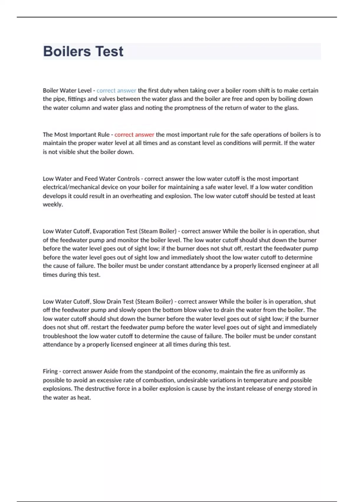 Boilers Test Predictions Exam Questions 2024. Boiler Water Level - correct answer the first duty when taking over a boiler room shift is to make certain the pipe, fittings and valves between the water glass and the boiler are free and open by boiling down the water column and water glass and noting the promptness of the return of water to the glass. The Most Important Rule - correct answer the most important rule for the safe operations of boilers is to maintain the proper water level at all times and as constant level as conditions will permit. If the water is not visible shut the boiler down. Low Water and Feed Water Controls - correct answer the low water cutoff is the most important electrical/mechanical device on your boiler for maintaining a safe water level. If a low water condition develops it could result in an overheating and explosion. The low water cutoff should be tested at least weekly. Low Water Cutoff, Evaporation Test (Steam Boiler) - correct answer While the boiler is in operation, shut of the feedwater pump and monitor the boiler level. The low water cutoff should shut down the burner before the water level goes out of sight low; if the burner does not shut off, restart the feedwater pump before the water level goes out of sight low and immediately shoot the low water cutoff to determine the cause of failure. The boiler must be under constant attendance by a properly licensed engineer at all times during this test. Low Water Cutoff, Slow Drain Test (Steam Boiler) - correct answer While the boiler is in operation, shut off the feedwater pump and slowly open the bottom blow valve to drain the water from the boiler. The low water cutoff should shut down the burner before the water level goes out of sight low; if the burner does not shut off. restart the feedwater pump before the water level goes out of sight and immediately troubleshoot the low water cutoff to determine the cause of failure. The boiler must be under constant attendance by a properly licensed engineer at all times during this test. Firing - correct answer Aside from the standpoint of the economy, maintain the fire as uniformly as possible to avoid an excessive rate of combustion, undesirable variations in temperature and possible explosions. The destructive force in a boiler explosion is cause by the instant release of energy stored in the water as heat.