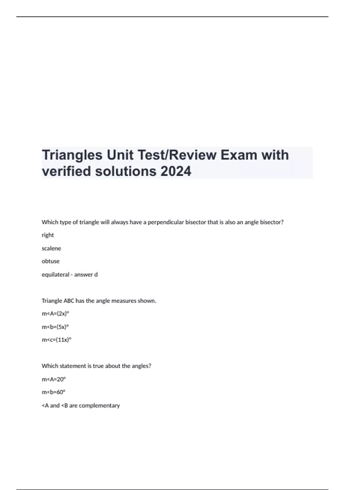Triangles Unit Test/Review Exam with verified solutions 2024