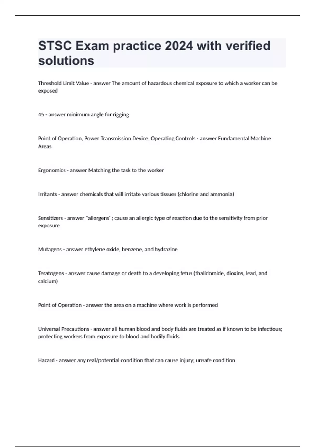 Threshold Limit Value The amount of hazardous chemical exposure to which a worker can be exposed 45 minimum angle for rigging Point of Operation, Power Transmission Device, Operating Controls Fundamental Machine Areas Ergonomics Matching the task to the worker Irritants chemicals that will irritate various tissues (chlorine and ammonia) Sensitizers "allergens"; cause an allergic type of reaction due to the sensitivity from prior exposure Mutagens ethylene oxide, benzene, and hydrazine Teratogens cause damage or death to a developing fetus (thalidomide, dioxins, lead, and calcium) Point of Operation the area on a machine where work is performed Universal Precautions all human blood and body fluids are treated as if known to be infectious; protecting workers from exposure to blood and bodily fluids Hazard any real/potential condition that can cause injury; unsafe condition Risk probability that a substance/situation will produce harm under specified condition Risk Analysis process of identifying safety risk Risk Assessment process of determining the risk presented by the identified hazards Loss Control System Identify hazardous conditions, assess the risks, and establish effective risk control measures Aerosol Suspension of liquid or solid particles dispersed in air Mist Suspension of liquid particles in air formed by condensation from vapor or by some mechanical process Fume solid particle aerosol formed by condensation from the vapor state Smoke Aerosol formed from combustion of organic material Dust Particulate material generated by a mechanical process System Life Cycle concept, system development, production/deployment, and sustainment/disposal Inhaled, eye/skin contact (absorption), ingestion, and injected 4 major exposure paths for chemical compounds to enter the body Check Valve a device that prevents the back-flow of oxygen and acetylene Elimination, Substitution, Engineering Controls, Warnings, Admin Controls, PPE Most to Least Effective Control Methods Authorized Employee an employee who locks out machines in order to perform servicing/maintenance Affected Employee an employee whose job requires him to operate a machine on which servicing is being performed under lockout Attendant an employee assigned to remain immediately outside the entrance to an enclosed space to render assistance Effective Listening supervisor skill demonstrated through empathy, rephrasing, and repeating Safety Audit A methodical examination of a company's existing procedures and practices to determine if they comply with legal requirements, internal policies, and best practices Hot Work Program To establish fire safety controls for operations involving welding or cutting, especially those conducted in proximity to combustible materials, many firms implement procedures that authorize these operations only after certain safeguards have been implemented. These procedures are called: Type 1 Hard Hat has a full brim around the entire hat Type 2 Hard Hat has a short brim only in the front of t