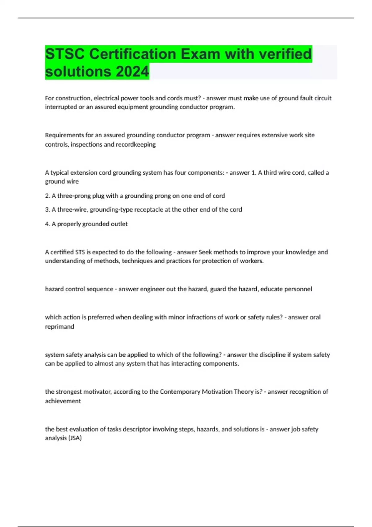 For construction, electrical power tools and cords must? must make use of ground fault circuit interrupted or an assured equipment grounding conductor program. Requirements for an assured grounding conductor program requires extensive work site controls, inspections and recordkeeping A typical extension cord grounding system has four components: 1. A third wire cord, called a ground wire 2. A three-prong plug with a grounding prong on one end of cord 3. A three-wire, grounding-type receptacle at the other end of the cord 4. A properly grounded outlet A certified STS is expected to do the following Seek methods to improve your knowledge and understanding of methods, techniques and practices for protection of workers. hazard control sequence engineer out the hazard, guard the hazard, educate personnel which action is preferred when dealing with minor infractions of work or safety rules? oral reprimand system safety analysis can be applied to which of the following? the discipline if system safety can be applied to almost any system that has interacting components. the strongest motivator, according to the Contemporary Motivation Theory is? recognition of achievement the best evaluation of tasks descriptor involving steps, hazards, and solutions is job safety analysis (JSA) System Saftey Analysis A broad term coveting all if the various system safety tools used in analysis of system risk A crew member deliberately violated a safety procedure. what should be done? stop work, write formal disciplinary report, and explain reasoning to worker. Recordable occupational illness on OSHA 300 log are categorized as follows injury, skin disorder, respiratory conditions, poisoning, hearing loss, all other illnesses Which of the following wpuld not be included under the provisions of ANSI Z16.2, the standardized method of recording accident falls? workers compensation rating hypoxia deficiency in the amount of oxygen teaching the tissues and can be experienced by industrial workers in extreme elevations, under heavy workloads or in confined spaces with oxygen deficiencies Caisson's disease also known as decompression sickness and can be experienced in divers or other high-powered environments. One example is underwater tunnels where pressure us maintained to avoid the effects of water leaking into the heading. DeQuervian disease a disorder caused from the narrowing of the tendon sheath for abductor muscles of the thumb, often seen in workers who perform manual task requiring firm grips Raynaud's phenomenon also known as white finger and results from a combination of cold and vibration , smaller arteries that supply blood to the skin constrict excessively in response to cold, limiting blood supply to the affected area Competent Person one who is capable of identifying existing and predictable hazards in the surroundings or working conditions which are unsanitary, hazardous, or dangerous to employees and who has authorization to take prompt corrective measures to eliminate them Job Safety Analysis Is a systematic analysis of job elements. It results in an in-depth evaluation by workers and first line supervisors of the individual steps and hazards, also offers protective measures or solutions to identified hazards Principle Benefits of JSA 1. allowing supervisor to perform training in safe efficient operations 2. allowing the supervisor or the other person developing the JSA to meet and work with employees 3. Instructing new employees on job specifics performed irregularly 4. acting as an accident investigation tool should a mishap occur 5. studying jobs to determine if improvement is possible What makes First-Aid training acceptable to OSHA? The training needs to be equivalent to national recognized training courses such as the U.S. Bureau of Mines, the American Red Cross etc. Additionally the training must be documented with a certificate, training record, wallet card etc. Add or remove terms