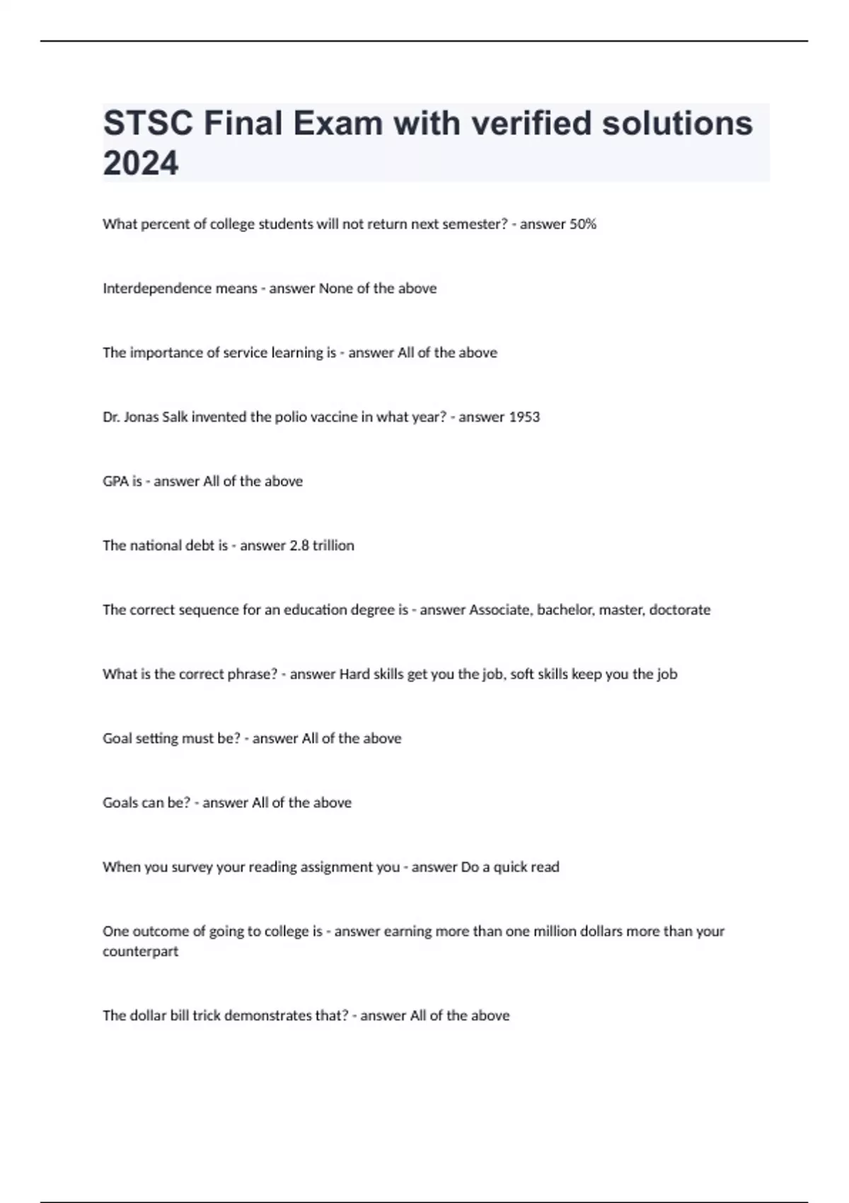 What percent of college students will not return next semester? 50% Interdependence means None of the above The importance of service learning is All of the above Dr. Jonas Salk invented the polio vaccine in what year? 1953 GPA is All of the above The national debt is 2.8 trillion The correct sequence for an education degree is Associate, bachelor, master, doctorate What is the correct phrase? Hard skills get you the job, soft skills keep you the job Goal setting must be? All of the above Goals can be? All of the above When you survey your reading assignment you Do a quick read One outcome of going to college is earning more than one million dollars more than your counterpart The dollar bill trick demonstrates that? All of the above Looking ahead at your life in the future Both a and b Many students are sure to register for next semester as soon as possible because Both a and b A distributed reading schedule means setting a schedule timeline for completing readings or studying A Cornell study sheet is a format for identifying questions and concepts Positive affirmations are important for everyone A service learning project might ask which of the following questions? All of the above A palindrome reads the same forwards and backward Which quadrant of self management should we spend most of our time in? quadrant 2, tasks are important but not urgent Howard Gardner's theory on multiple intelligences says people learn through different learning styles This method of keeping a calendar helps prevent procrastination? Monthly calendar The "Marshmallow Experiment" concluded concluded that self discipline is an indicator of success Which of the following is not a job benefit? Department meetings