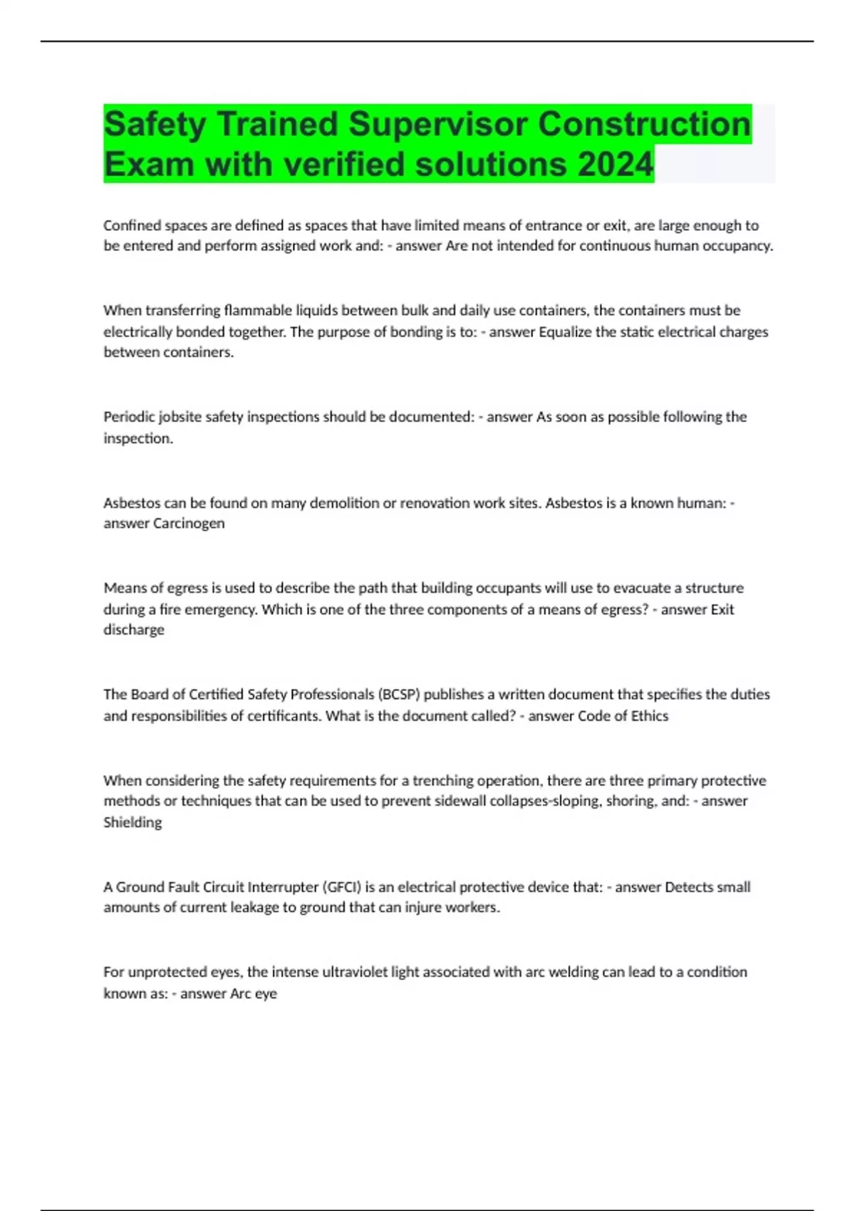 Confined spaces are defined as spaces that have limited means of entrance or exit, are large enough to be entered and perform assigned work and: Are not intended for continuous human occupancy. When transferring flammable liquids between bulk and daily use containers, the containers must be electrically bonded together. The purpose of bonding is to: Equalize the static electrical charges between containers. Periodic jobsite safety inspections should be documented: As soon as possible following the inspection. Asbestos can be found on many demolition or renovation work sites. Asbestos is a known human: Carcinogen Means of egress is used to describe the path that building occupants will use to evacuate a structure during a fire emergency. Which is one of the three components of a means of egress? Exit discharge The Board of Certified Safety Professionals (BCSP) publishes a written document that specifies the duties and responsibilities of certificants. What is the document called? Code of Ethics When considering the safety requirements for a trenching operation, there are three primary protective methods or techniques that can be used to prevent sidewall collapses-sloping, shoring, and: Shielding A Ground Fault Circuit Interrupter (GFCI) is an electrical protective device that: Detects small amounts of current leakage to ground that can injure workers. For unprotected eyes, the intense ultraviolet light associated with arc welding can lead to a condition known as: Arc eye Portable fire extinguishers are labeled for the specific type of fire they can be used on. What type of fire extinguisher is appropriate for use on fires involving combustible metals such as magnesium or titanium? Class D A key element of effective communications between a supervisor and subordinate is to: Create a shared understanding Warning line systems are an acceptable means of preventing falls from roofs that are not equipped with fixed rail protective systems. At what distance apart MUST warning line systems be placed from the roof's edge? 6 Feet Which jobs represent the highest priority for a formal Job Safety Analysis (JSA)? Jobs with a high frequency of injuries A fire prevention plan should be developed for all demolition or construction projects. At a MINIMUM, the plan should include key personnel responsibilities, evacuation protocols, and: Pre-planning with local fire departments and response agencies. You were recently promoted to a supervisory position following your graduation from a technical school. Your first task today is to introduce a new safety procedure to a group of employees with an average of 15 years of on-the-job experience. Sensing they might resist the message because of your youth and inexperience, what communication technique should you consider? Use a group problem solving method that shows respect for their experience. A Type II commercial, medium-duty ladder suitable for painting and similar tasks has a load capacity of: 225 pounds (102.1 Kilograms) Upon completion of welding or other hot work operations, how long should a fire watcher be posted to make sure that smoldering fires have not been started? 30 minutes What is the recommended safety factor (the ratio between its breaking strength and safe working load) for best condition (new) fiber ropes? 4:1 A chemical cartridge respirator is an example of what type of respiratory protective device? Air purifying respirator As a safety supervisor, you have been instructed to create and train a fire brigade to minimize property damage from unexpected fire incidents. You have decided that the fire brigade will only be responsible to fight small fires that can be controlled with portable fire extinguishers without the need for protective clothing or breathing apparatus. What is this type of fire brigade called? Incipient stage fire brigade When developing safety training programs, it is important to understand how people learn. The three primary learning theories are cognitive, behavioral, and motivational. Which is the PRIMARY focus of the cognitive learning theory? How people process new information Fall protection systems generally fall into two categories-passive and active. Which is an example of an active fall protection system? Lifelines Many construction sites have roads and vehicular traffic patterns that should be safeguarded by establishing a Temporary Traffic Control Zone (TTCZ). The four basic elements of an effective TTCZ are advance warnings, transition, activity area, and: Termination.