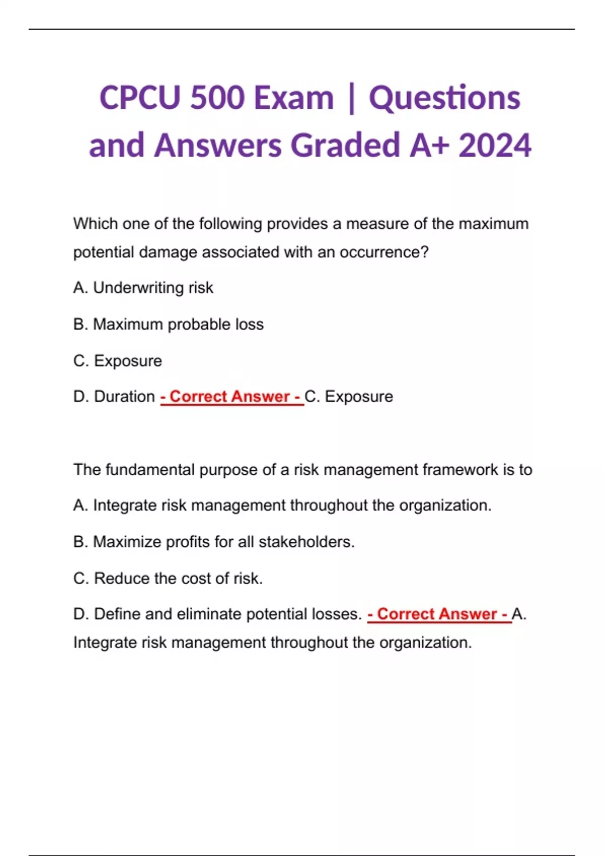 BUNDLE for CPCU 500 | Becoming a Leader in Risk Management and Insurance Exam | Questions and Answers 2024 Graded A+