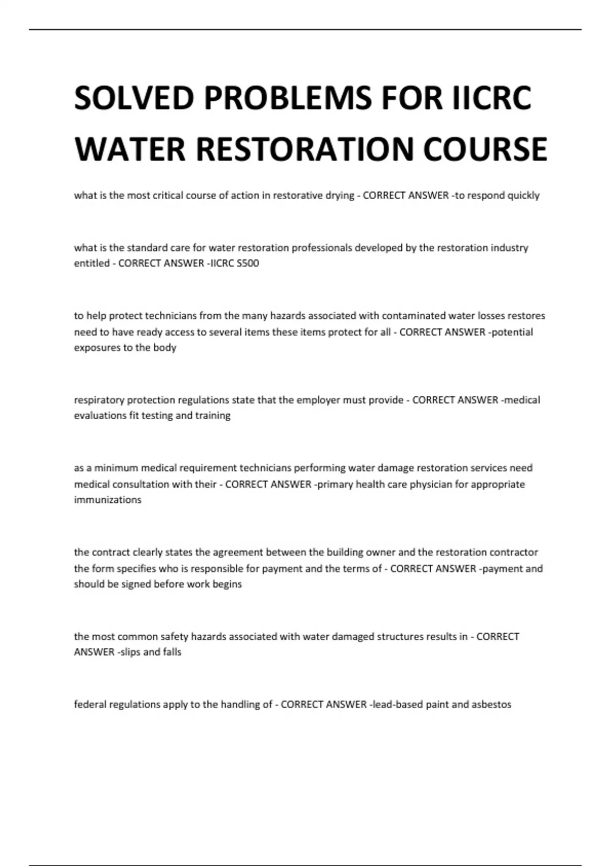 SOLVED PROBLEMS FOR IICRC WATER RESTORATION COURSE what is the most critical course of action in restorative drying - CORRECT ANSWER -to respond quickly what is the standard care for water restoration professionals developed by the restoration industry entitled - CORRECT ANSWER -IICRC S500 to help protect technicians from the many hazards associated with contaminated water losses restores need to have ready access to several items these items protect for all - CORRECT ANSWER -potential exposures to the body respiratory protection regulations state that the employer must provide - CORRECT ANSWER -medical evaluations fit testing and training as a minimum medical requirement technicians performing water damage restoration services need medical consultation with their - CORRECT ANSWER -primary health care physician for appropriate immunizations the contract clearly states the agreement between the building owner and the restoration contractor the form specifies who is responsible for payment and the terms of - CORRECT ANSWER -payment and should be signed before work begins the most common safety hazards associated with water damaged structures results in - CORRECT ANSWER -slips and falls federal regulations apply to the handling of - CORRECT ANSWER -lead-based paint and asbestos