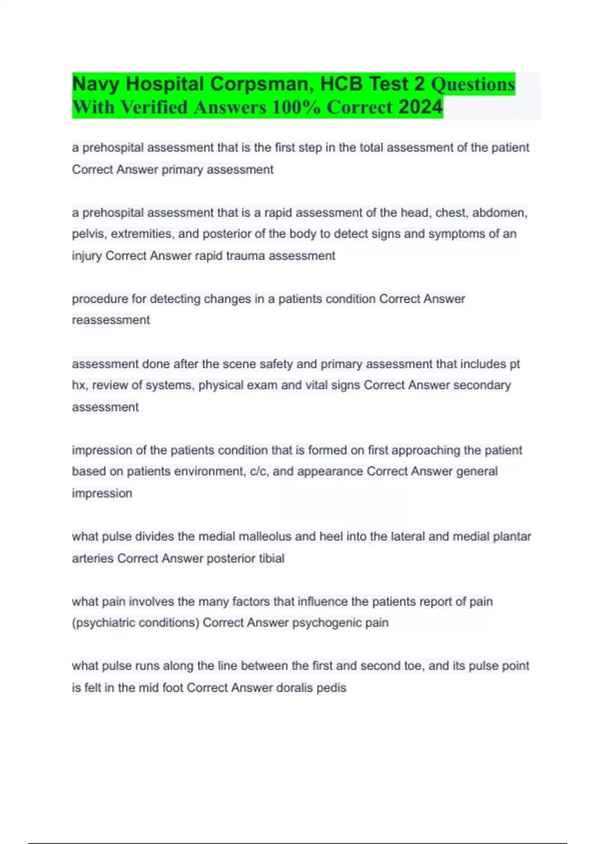 Navy Hospital Corpsman, HCB Test 2 Questions With Verified Answers 100% Correct 2024 a prehospital assessment that is the first step in the total assessment of the patient Correct Answer primary assessment a prehospital assessment that is a rapid assessment of the head, chest, abdomen, pelvis, extremities, and posterior of the body to detect signs and symptoms of an injury Correct Answer rapid trauma assessment procedure for detecting changes in a patients condition Correct Answer reassessment assessment done after the scene safety and primary assessment that includes pt hx, review of systems, physical exam and vital signs Correct Answer secondary assessment impression of the patients condition that is formed on first approaching the patient based on patients environment, c/c, and appearance Correct Answer general impression what pulse divides the medial malleolus and heel into the lateral and medial plantar arteries Correct Answer posterior tibial what pain involves the many factors that influence the patients report of pain (psychiatric conditions) Correct Answer psychogenic pain what pulse runs along the line between the first and second toe, and its pulse point is felt in the mid foot Correct Answer doralis pedis what type of pain is the alteration of central nervous system processing of sensation, leading to amplification of pain signals Correct Answer central sensitization what is used in conjunction with the stethoscope to allow you to accurately obtain the patients bp Correct Answer sphygmomanometer what pain is without identifiable etiology Correct Answer idiopathic auscultation of most sounds requires the use of a Correct Answer stethoscope Whats the flow of blood through tissues, providing them with O2 and nutrients and removing waste products Correct Answer perfusion weak and rapid pulse Correct Answer thready pulse labored or difficult breathing Correct Answer dyspnea what type of pain is linked to tissue damage to the skin musculoskeletal system Correct Answer nociceptive