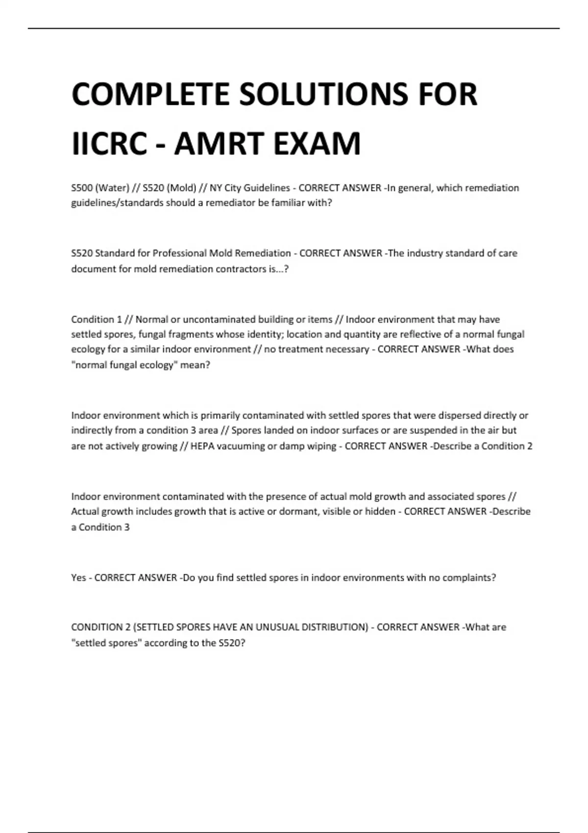 COMPLETE SOLUTIONS FOR IICRC - AMRT EXAM S500 (Water) // S520 (Mold) // NY City Guidelines - CORRECT ANSWER -In general, which remediation guidelines/standards should a remediator be familiar with? S520 Standard for Professional Mold Remediation - CORRECT ANSWER -The industry standard of care document for mold remediation contractors is...? Condition 1 // Normal or uncontaminated building or items // Indoor environment that may have settled spores, fungal fragments whose identity; location and quantity are reflective of a normal fungal ecology for a similar indoor environment // no treatment necessary - CORRECT ANSWER -What does "normal fungal ecology" mean? Indoor environment which is primarily contaminated with settled spores that were dispersed directly or indirectly from a condition 3 area // Spores landed on indoor surfaces or are suspended in the air but are not actively growing // HEPA vacuuming or damp wiping - CORRECT ANSWER -Describe a Condition 2 Indoor environment contaminated with the presence of actual mold growth and associated spores // Actual growth includes growth that is active or dormant, visible or hidden - CORRECT ANSWER -Describe a Condition 3 Yes - CORRECT ANSWER -Do you find settled spores in indoor environments with no complaints? CONDITION 2 (SETTLED SPORES HAVE AN UNUSUAL DISTRIBUTION) - CORRECT ANSWER -What are "settled spores" according to the S520?