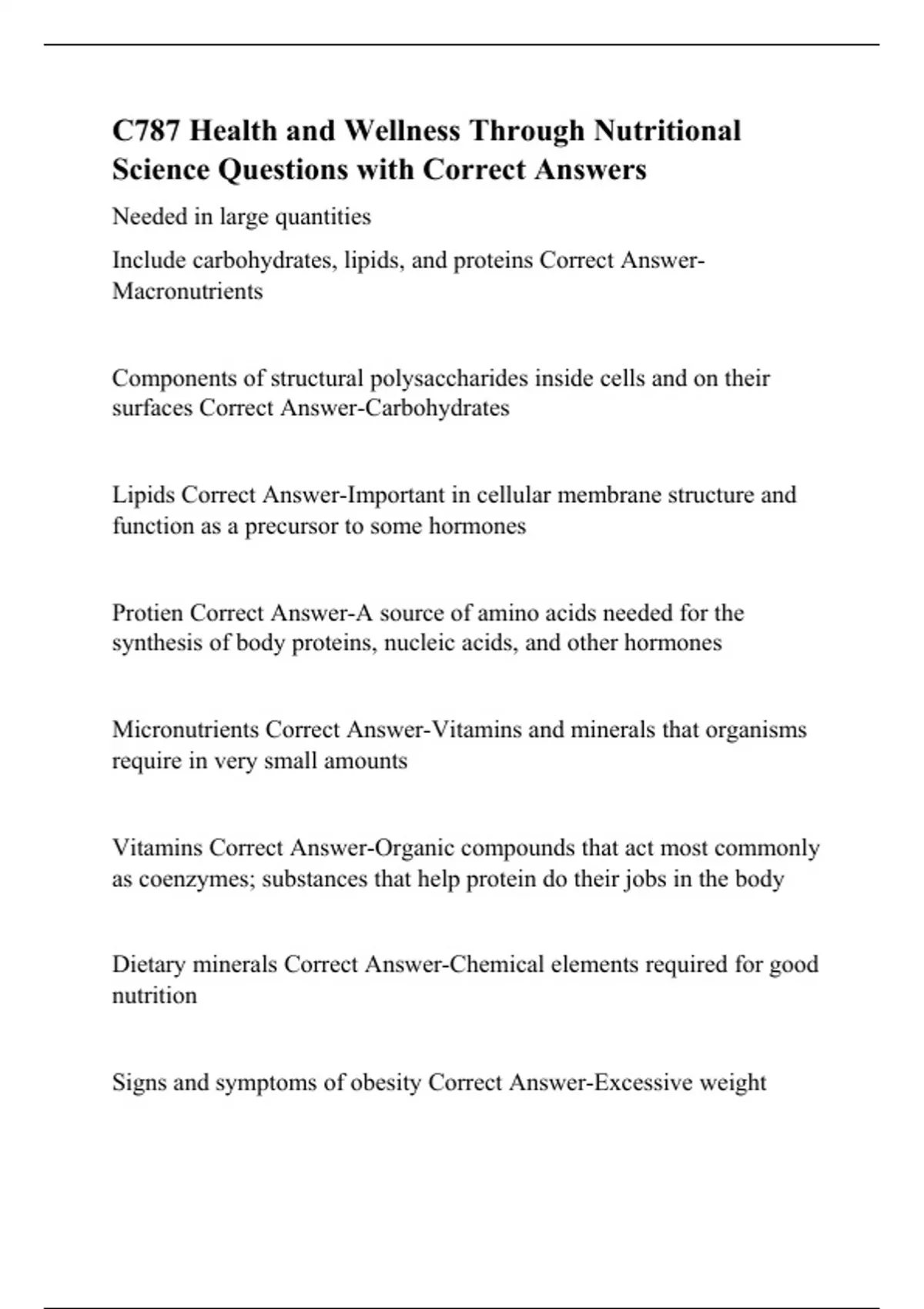 C787 Health and Wellness Through Nutritional Science Questions with Correct Answers