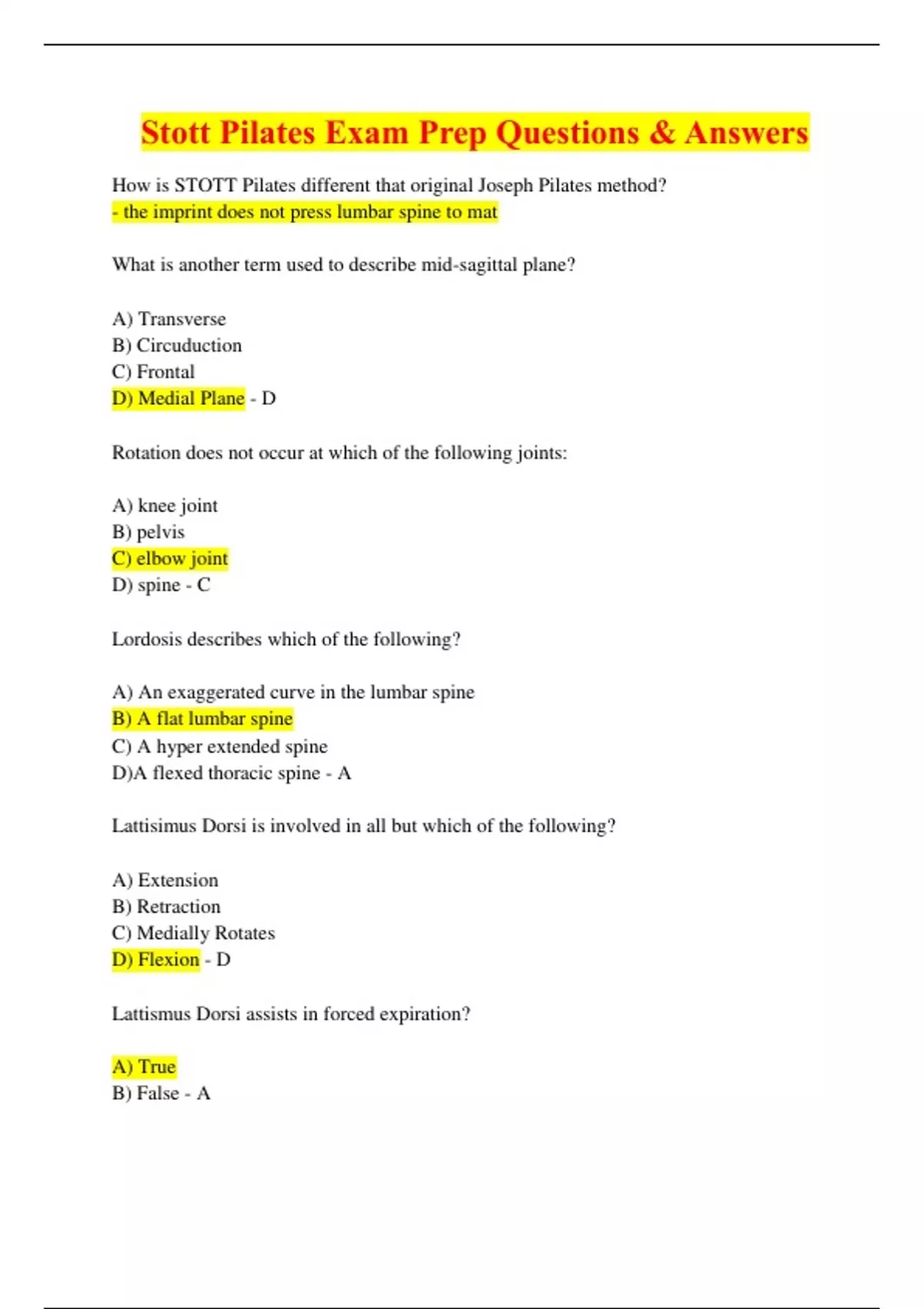 Stott Pilates Exam Prep Questions & Answers 2024-How is STOTT Pilates different that original Joseph Pilates method? - the imprint does not press lumbar spine to mat What is another term used to describe mid-sagittal plane? A) Transverse B) Circuduction C) Frontal D) Medial Plane - D Rotation does not occur at which of the following joints: A) knee joint B) pelvis C) elbow joint D) spine - C Lordosis describes which of the following? A) An exaggerated curve in the lumbar spine B) A flat lumbar spine C) A hyper extended spine D)A flexed thoracic spine - A Lattisimus Dorsi is involved in all but which of the following? A) Extension B) Retraction C) Medially Rotates D) Flexion - D Lattismus Dorsi assists in forced expiration? A) True B) False - A Which muscle flexes the knee and extends the hip? A) Rectus Femoris B) Semimembranousous C) Semitendinous D Bicepts Femoris - D Which muscle protracts the scapula? A) Latissumus Dorsi B) Serratus Anterior C) Rhomboids D) Mid Trapezius - B Which joint involves the glenoid fossa? A) Shoulder Joint B) Knee Joint C) Elbow Joint - A What does contra-lateral mean? A) same side of body B) front side of body C) opposite side of body - C The scapula articulates which of the following? A) Ribs B) Clavicle C) Spine - B Which of the following is not one of the Joseph Pilates original principles? A) Breathing B) Precision C) Scapular Placement D) Control - C Which bony landmark is on the femur? A) ASIS B) PSIS C) Lesser Trochantor - C Gluteus Max does not do which of the following? A) medial rotate at the hip B) laterally rotate at the hip C) Extend at the hip - A What is the action of the Serratus Posterior Superior? A) Retracts the ribs during inspiration B) Elevates the ribs during inspiration C) Protracts the ribs during inspiration - B What is typically present in kyphosis-lordosis posture? A) Posterior tilt in pelvis B) Anterior tilt in pelvis C) Neutral tilt in pelvis - B Which of the following muscle fibers run mainly horizontally? A) Rectus Abdominus B) Transversus Abdominus C) Internal Abdominal Oblique D) External Abdominal Oblique E) Obliques - B If the thoracic spine is flat, which of the following is present? A) Lengthened B) Neutral C) Imprint - A What is not an anatomical structure? A) Obturator Foramen B) Obturator Externus C) Obturator Internus - A
