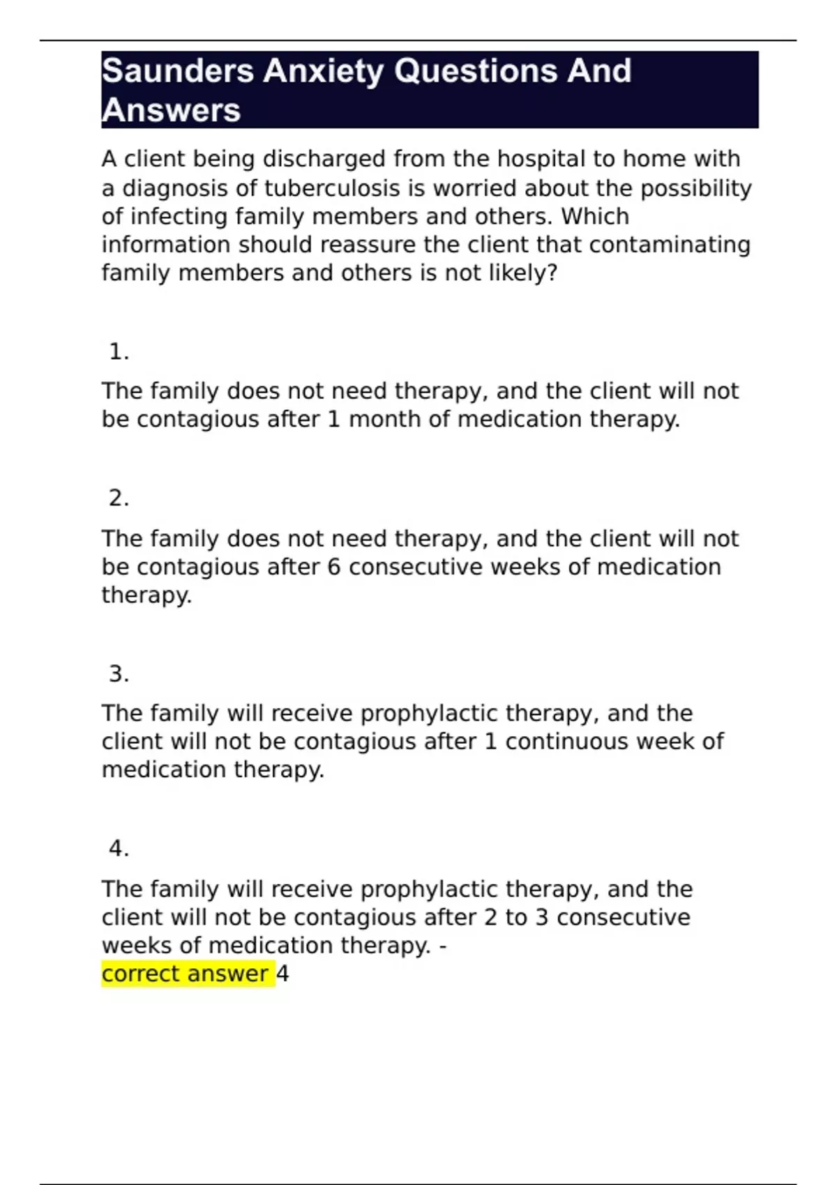 The family will receive prophylactic therapy, and the client will not be contagious after 2 to 3 consecutive weeks of medication therapy. - correct answer 4 Saunders Anxiety Questions And Answers The nurse enters a client's room, and the client immediately demands to be released from the hospital. During review of the client's record, the nurse notes that the client was admitted 2 days ago for the treatment of an anxiety disorder and that the admission was a voluntary one. The nurse reports the findings to the registered nurse (RN) and expects that the RN will take which action? 1.