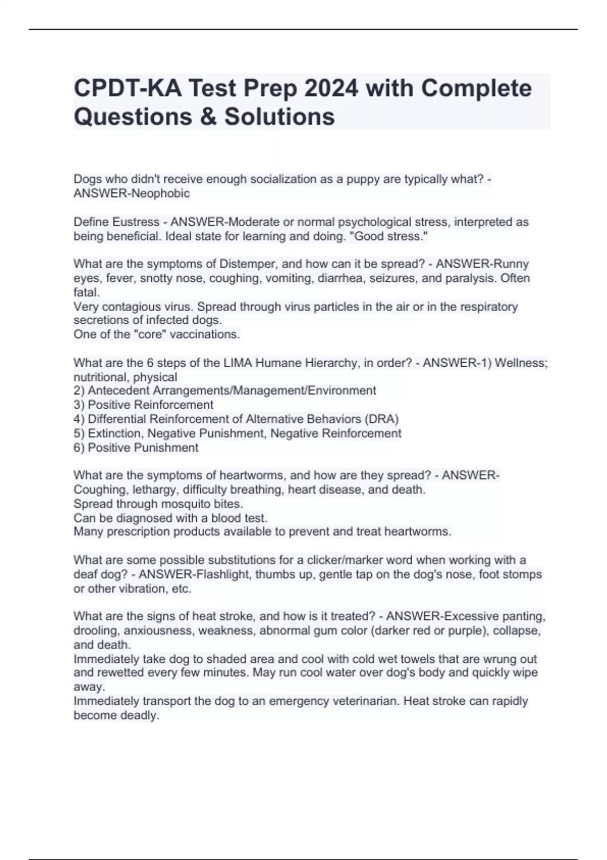 CPDT-KA Test Prep 2024 with Complete Questions & Solutions CPDT-KA Test Prep 2024 with Complete Questions & Solutions CPDT-KA Test Prep 2024 with Complete Questions & Solutions Dogs who didn't receive enough socialization as a puppy are typically what? - ANSWER-Neophobic Define Eustress - ANSWER-Moderate or normal psychological stress, interpreted as being beneficial. Ideal state for learning and doing. "Good stress." What are the symptoms of Distemper, and how can it be spread? - ANSWER-Runny
