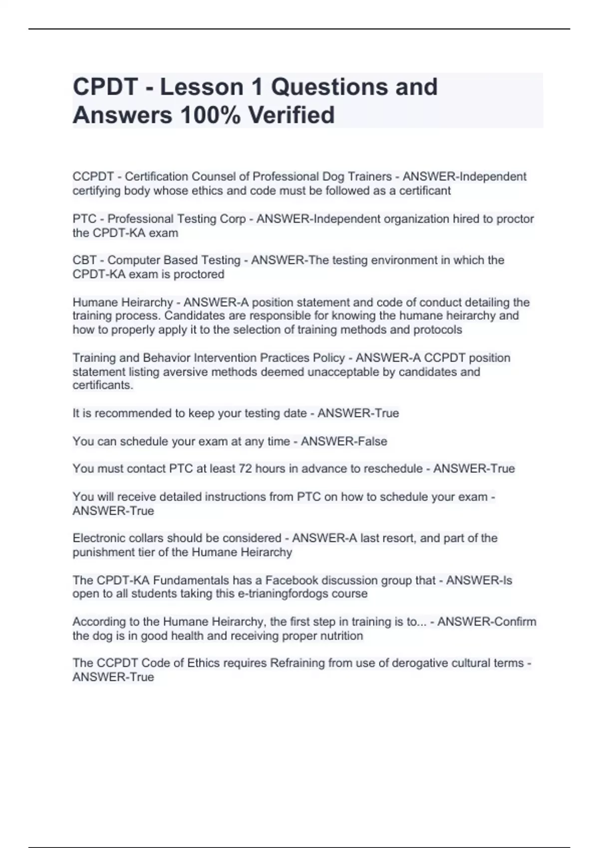 CPDT - Lesson 1 Questions and Answers 100% VerifiedCPDT - Lesson 1 Questions and Answers 100% VerifiedCPDT - Lesson 1 Questions and Answers 100% VerifiedCPDT - Lesson 1 Questions and Answers 100% Verified CCPDT - Certification Counsel of Professional Dog Trainers - ANSWER-Independent certifying body whose ethics and code must be followed as a certificant PTC - Professional Testing Corp - ANSWER-Independent organization hired to proctor the CPDT-KA exam CBT - Computer Based Testing - ANSWER-The testing environment in which the CPDT-KA exam is proctored Humane Heirarchy - ANSWER-A position statement and code of conduct detailing the training process. Candidates are responsible for knowing the humane heirarchy and