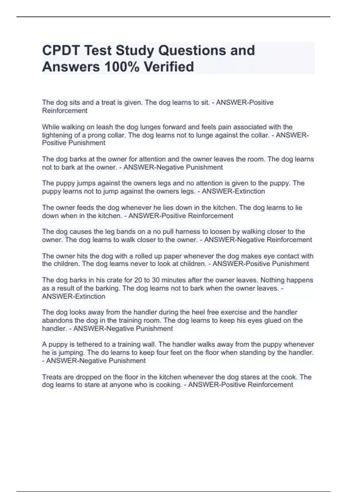 CPDT Test Study Questions and Answers 100% VerifiedCPDT Test Study Questions and Answers 100% VerifiedCPDT Test Study Questions and Answers 100% VerifiedCPDT Test Study Questions and Answers 100% VerifiedCPDT Test Study Questions and Answers 100% VerifiedThe dog sits and a treat is given. The dog learns to sit. - ANSWER-Positive Reinforcement While walking on leash the dog lunges forward and feels pain associated with the tightening of a prong collar. The dog learns not to lunge against the collar. - ANSWER-Positive Punishment The dog barks at the owner for attention and the owner leaves the room. The dog learns not to bark at the owner. - ANSWER-Negative Punishment