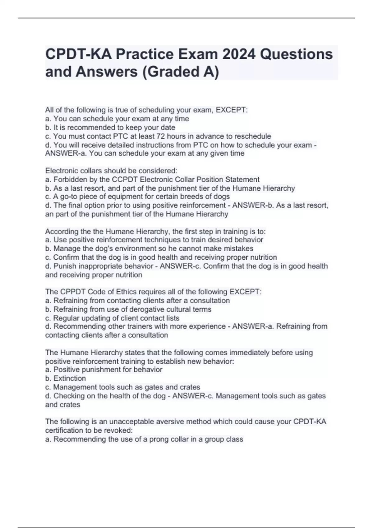 CPDT-KA Practice Exam 2024 Questions and Answers (Graded A) CPDT-KA Practice Exam 2024 Questions and Answers (Graded A) CPDT-KA Practice Exam 2024 Questions and Answers (Graded A) CPDT-KA Practice Exam 2024 Questions and Answers (Graded A) All of the following is true of scheduling your exam, EXCEPT: a. You can schedule your exam at any time b. It is recommended to keep your date c. You must contact PTC at least 72 hours in advance to reschedule d. You will receive detailed instructions from PTC on how to schedule your exam - ANSWER-a. You can schedule your exam at any given time Electronic collars should be considered: a. Forbidden by the CCPDT Electronic Collar Position Statement b. As a last resort, and part of the punishment tier of the Humane Hierarchy c. A go-to piece of equipment for certain breeds of dogs d. The final option prior to using positive reinforcement - ANSWER-b. As a last resort, an part of the punishment tier of the Humane Hierarchy According the the Humane Hierarchy, the first step in training is to: a. Use positive reinforcement techniques to train desired behavior b. Manage the dog's environment so he cannot make mistakes