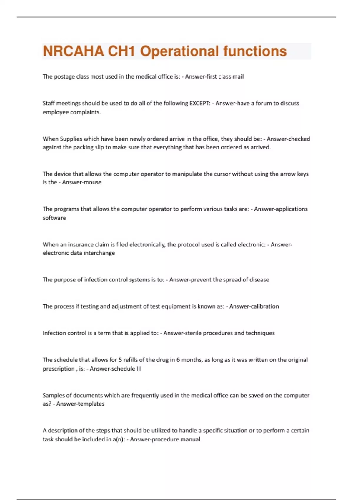 The postage class most used in the medical office is: - Answer-first class mail Staff meetings should be used to do all of the following EXCEPT: - Answer-have a forum to discuss employee complaints. When Supplies which have been newly ordered arrive in the office, they should be: - Answer-checked against the packing slip to make sure that everything that has been ordered as arrived. The device that allows the computer operator to manipulate the cursor without using the arrow keys is the - Answer-mouse The programs that allows the computer operator to perform various tasks are: - Answer-applications software When an insurance claim is filed electronically, the protocol used is called electronic: - Answerelectronic data interchange The purpose of infection control systems is to: - Answer-prevent the spread of disease The process if testing and adjustment of test equipment is known as: - Answer-calibration Infection control is a term that is applied to: - Answer-sterile procedures and techniques The schedule that allows for 5 refills of the drug in 6 months, as long as it was written on the original prescription , is: - Answer-schedule III Samples of documents which are frequently used in the medical office can be saved on the computer as? - Answer-templates A description of the steps that should be utilized to handle a specific situation or to perform a certain task should be included in a(n): - Answer-procedure manualThe basic four activities in cleaning the exam room between patients are: - Answer-pick up, clean the surfaces, put clean paper in the exam table, wash your hands. Cleaning supplies and chemical solutions needed to keep the exam room clean and sanitary should be kept handy in: - Answer-in a central area used to store all cleaning materials. Biohazard containers should be emptied: - Answer-daily Databases are: - Answer-Sets of records of information