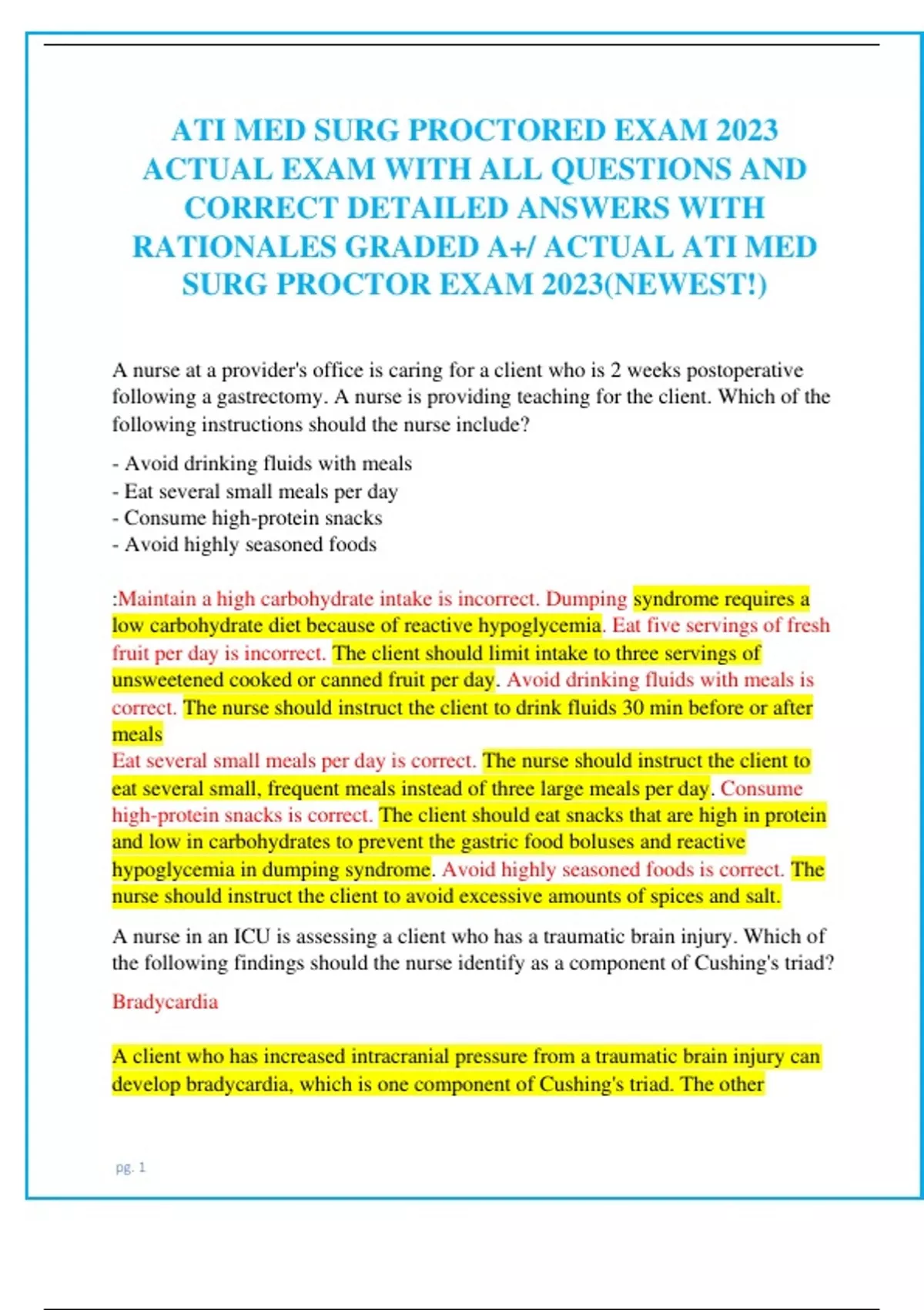 ATI MED SURG PROCTORED EXAM 2023 ACTUAL EXAM WITH ALL QUESTIONS AND CORRECT DETAILED ANSWERS WITH RATIONALES GRADED A+/ ACTUAL ATI MED SURG PROCTOR EXAM 2023(NEWEST!) A nurse at a provider's office is caring for a client who is 2 weeks postoperative following a gastrectomy. A nurse is providing teaching for the client. Which of the following instructions should the nurse include? - Avoid drinking fluids with meals - Eat several small meals per day - Consume high-protein snacks - Avoid highly seasoned foods :Maintain a high carbohydrate intake is incorrect. Dumping syndrome requires a low carbohydrate diet because of reactive hypoglycemia. Eat five servings of fresh fruit per day is incorrect. The client should limit intake to three servings of unsweetened cooked or canned fruit per day. Avoid drinking fluids with meals is correct. The nurse should instruct the client to drink fluids 30 min before or after meals Eat several small meals per day is correct. The nurse should instruct the client to eat several small, frequent meals instead of three large meals per day. Consume high-protein snacks is correct. The client should eat snacks that are high in protein and low in carbohydrates to prevent the gastric food boluses and reactive hypoglycemia in dumping syndrome. Avoid highly seasoned foods is correct. The nurse should instruct the client to avoid excessive amounts of spices and salt. A nurse in an ICU is assessing a client who has a traumatic brain injury. Which of the following findings should the nurse identify as a component of Cushing's triad? Bradycardia