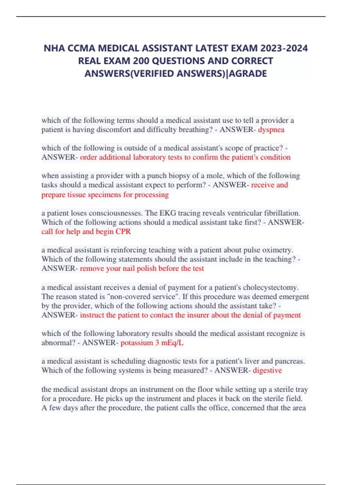 NHA CCMA MEDICAL ASSISTANT LATEST EXAM REAL EXAM 200 QUESTIONS AND CORRECT ANSWERS(VERIFIED ANSWERS)|AGRADE