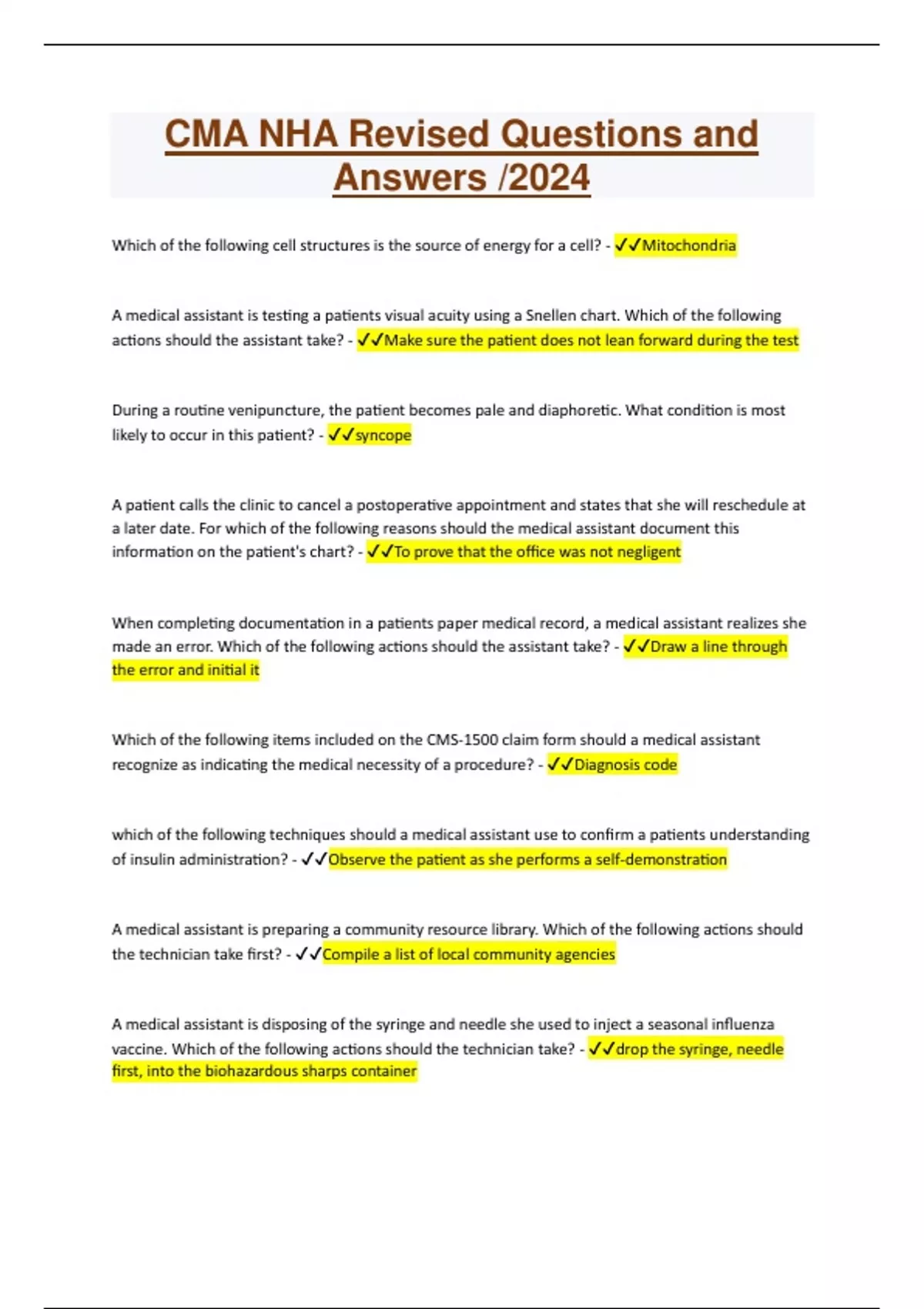 Which of the following cell structures is the source of energy for a cell? - Mitochondria A medical assistant is testing a patients visual acuity using a Snellen chart. Which of the following actions should the assistant take? - Make sure the patient does not lean forward during the test During a routine venipuncture, the patient becomes pale and diaphoretic. What condition is most likely to occur in this patient? - syncope A patient calls the clinic to cancel a postoperative appointment and states that she will reschedule at a later date. For which of the following reasons should the medical assistant document this information on the patient's chart? - To prove that the office was not negligent