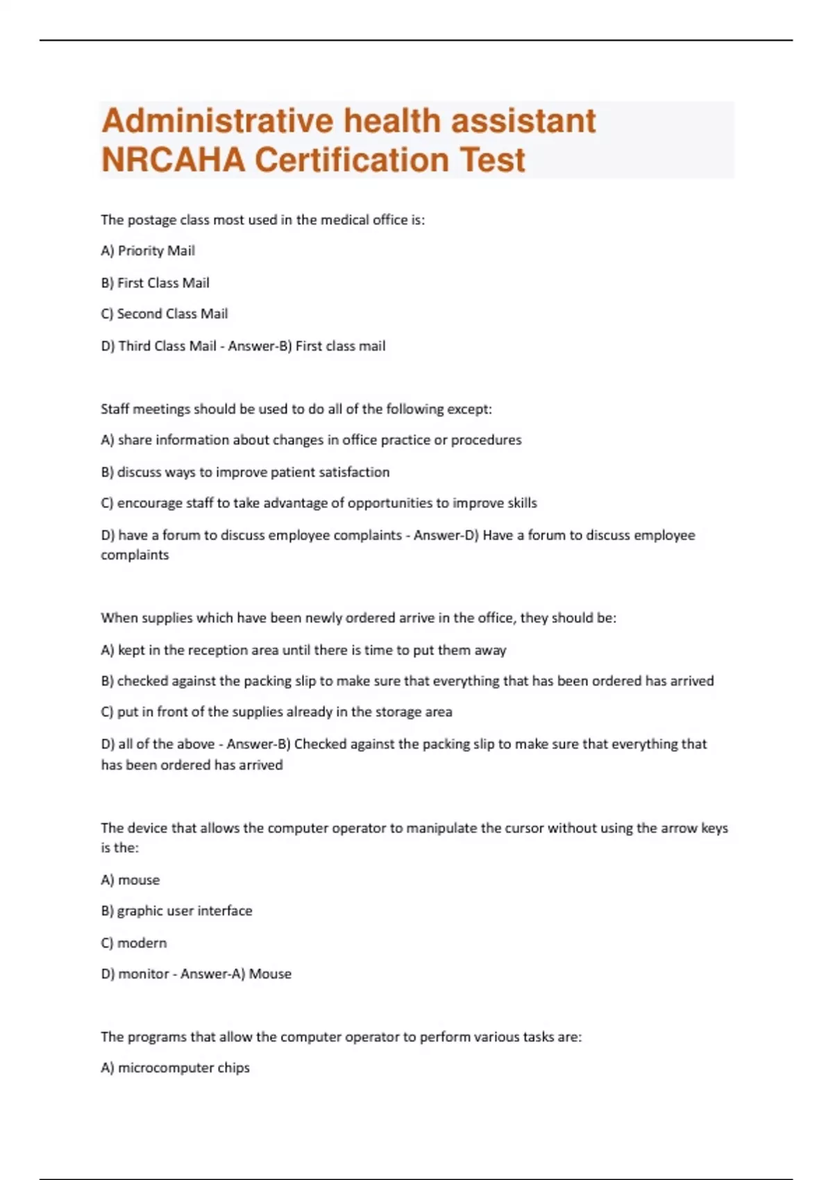 The postage class most used in the medical office is: A) Priority Mail B) First Class Mail C) Second Class Mail D) Third Class Mail - Answer-B) First class mail Staff meetings should be used to do all of the following except: A) share information about changes in office practice or procedures B) discuss ways to improve patient satisfaction C) encourage staff to take advantage of opportunities to improve skills D) have a forum to discuss employee complaints - Answer-D) Have a forum to discuss employee complaints When supplies which have been newly ordered arrive in the office, they should be: A) kept in the reception area until there is time to put them away B) checked against the packing slip to make sure that everything that has been ordered has arrived C) put in front of the supplies already in the storage area D) all of the above - Answer-B) Checked against the packing slip to make sure that everything that has been ordered has arrived The device that allows the computer operator to manipulate the cursor without using the arrow keys is the: A) mouse B) graphic user interface C) modern D) monitor - Answer-A) Mouse The programs that allow the computer operator to perform various tasks are: A) microcomputer chipsB) motherboard C) CPUs D) applications software - Answer-D) Applications software When an insurance claim is filed electronically, the protocol used is called electronic: A) Transaction B) Payment C) filing D) data interchange - Answer-D) Data Interchange The purpose of infection control systems is to: A) comply with state regulations B) determine how disease is transmitted C) prevent the spread of disease D) maintain a high level of cleanliness - Answer-C) Prevent the spread of disease