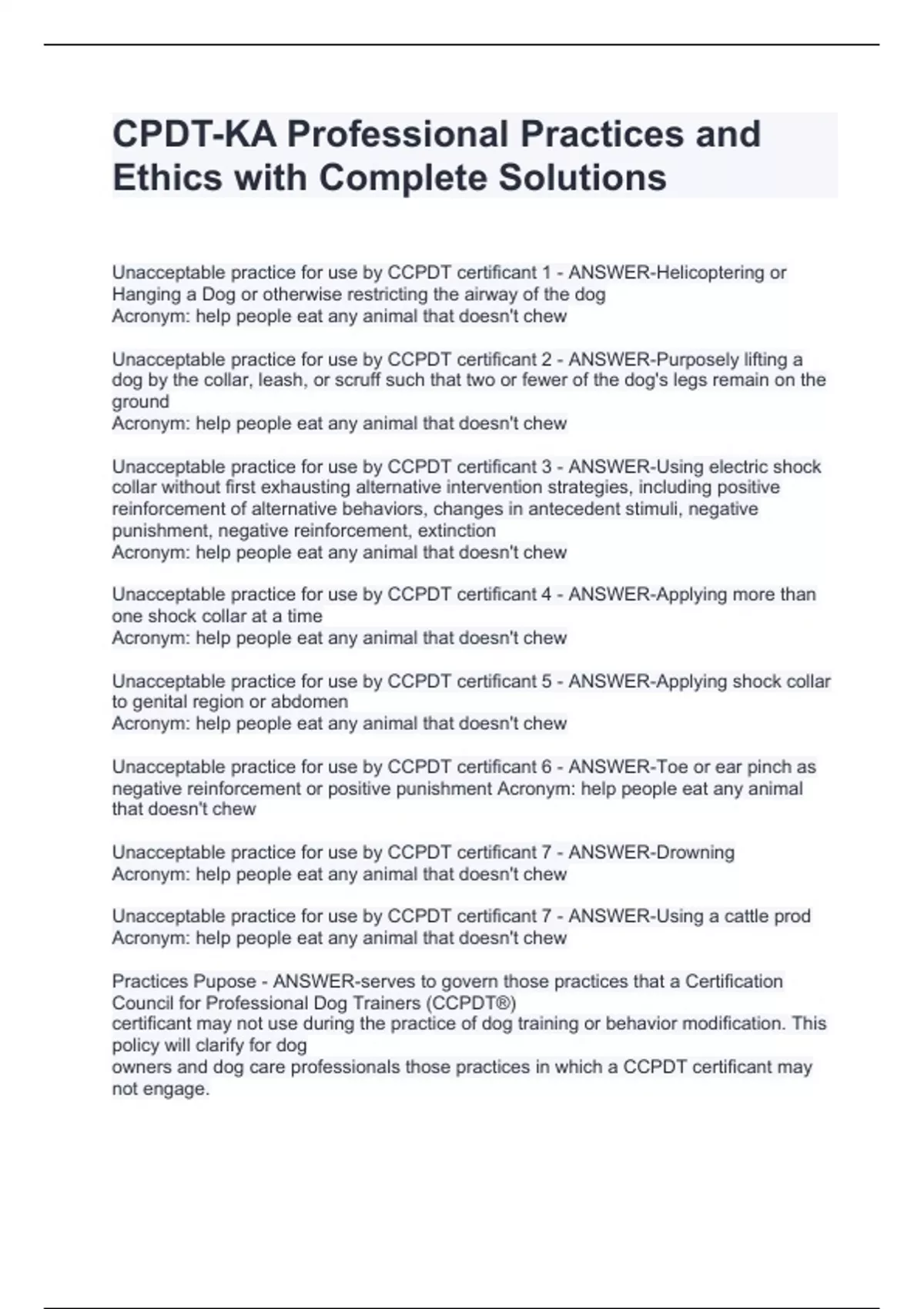 CPDT-KA Professional Practices and Ethics with Complete Solutions CPDT-KA Professional Practices and Ethics with Complete Solutions CPDT-KA Professional Practices and Ethics with Complete Solutions CPDT-KA Professional Practices and Ethics with Complete Solutions Unacceptable practice for use by CCPDT certificant 1 - ANSWER-Helicoptering or Hanging a Dog or otherwise restricting the airway of the dog Acronym: help people eat any animal that doesn't chew Unacceptable practice for use by CCPDT certificant 2 - ANSWER-Purposely lifting a dog by the collar, leash, or scruff such that two or fewer of the dog's legs remain on the ground Acronym: help people eat any animal that doesn't chew Unacceptable practice for use by CCPDT certificant 3 - ANSWER-Using electric shock collar without first exhausting alternative intervention strategies, including positive