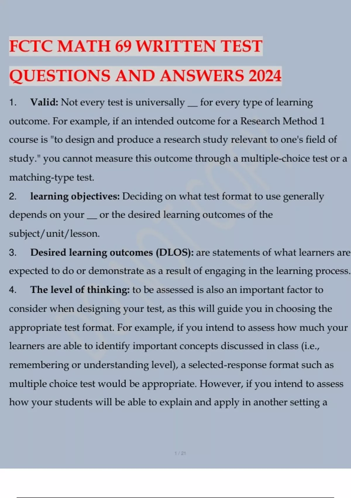 FCTC MATH 69 WRITTEN TEST QUESTIONS AND ANSWERS 2024
