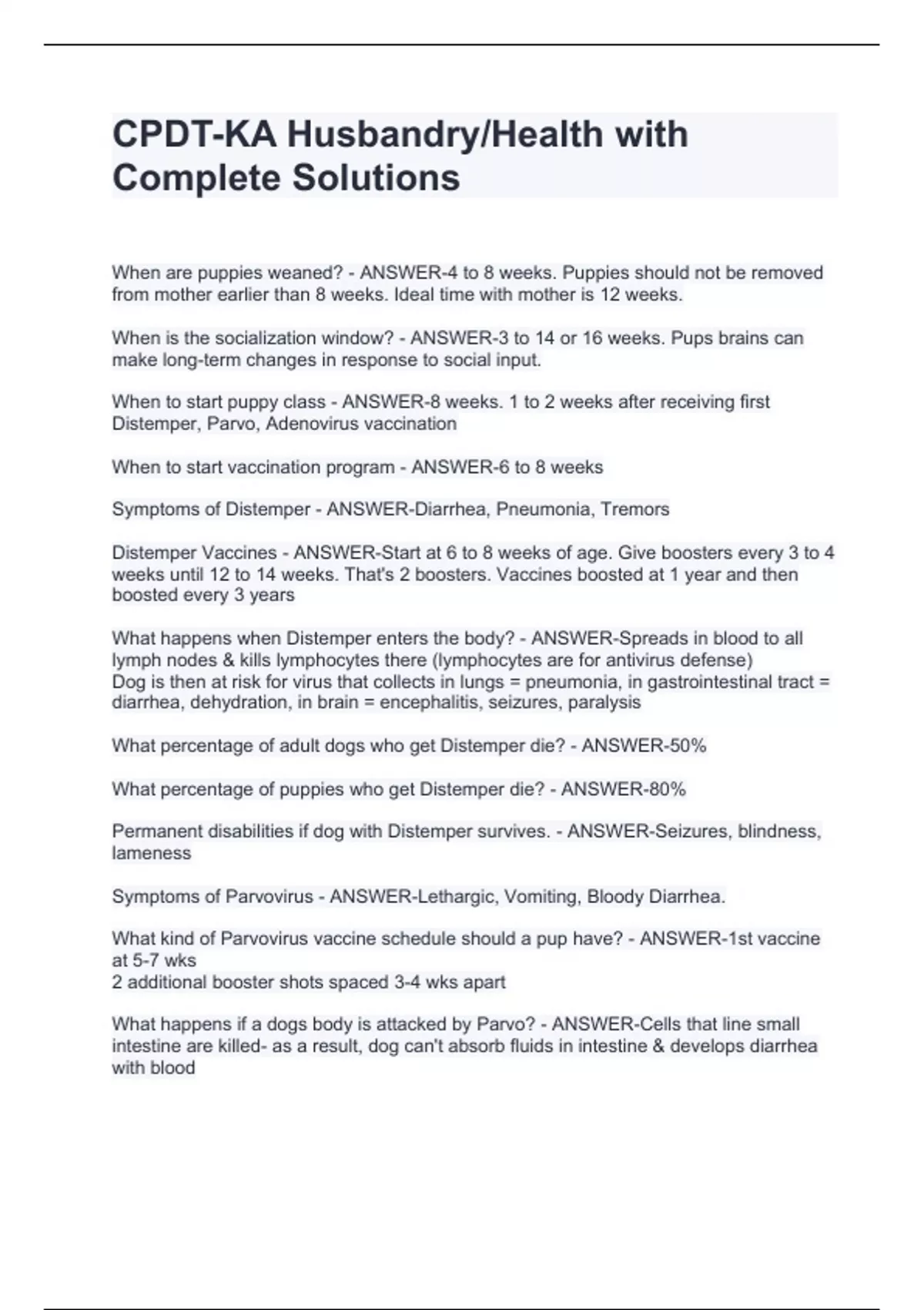 CPDT-KA Husbandry/Health with Complete Solutions CPDT-KA Husbandry/Health with Complete Solutions CPDT-KA Husbandry/Health with Complete Solutions CPDT-KA Husbandry/Health with Complete Solutions When are puppies weaned? - ANSWER-4 to 8 weeks. Puppies should not be removed from mother earlier than 8 weeks. Ideal time with mother is 12 weeks. When is the socialization window? - ANSWER-3 to 14 or 16 weeks. Pups brains can make long-term changes in response to social input. When to start puppy class - ANSWER-8 weeks. 1 to 2 weeks after receiving first