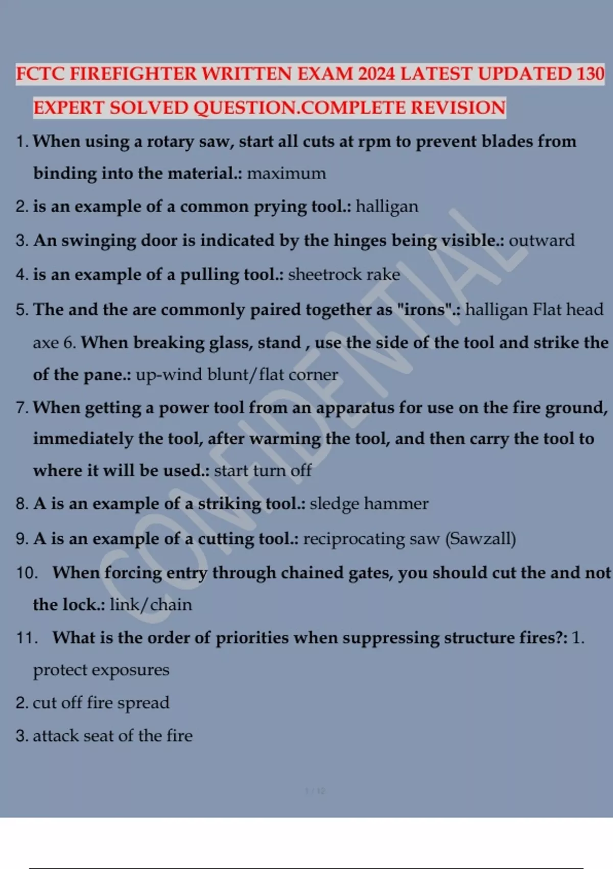 FCTC FIREFIGHTER WRITTEN EXAM 2024 LATEST UPDATED 130 EXPERT SOLVED QUESTION.COMPLETE REVISION