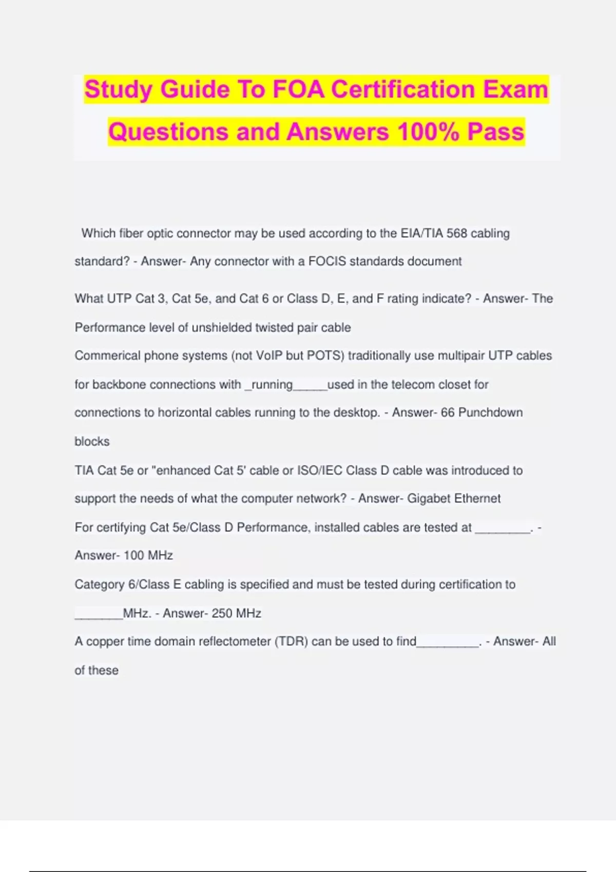 Study Guide To FOA Certification Exam Questions and Answers 100% Pass Which fiber optic connector may be used according to the EIA/TIA 568 cabling standard? - Answer- Any connector with a FOCIS standards document What UTP Cat 3, Cat 5e, and Cat 6 or Class D, E, and F rating indicate? - Answer- The Performance level of unshielded twisted pair cable Commerical phone systems (not VoIP but POTS) traditionally use multipair UTP cables for backbone connections with _running_____used in the telecom closet for connections to horizontal cables running to the desktop. - Answer- 66 Punchdown blocks TIA Cat 5e or "enhanced Cat 5' cable or ISO/IEC Class D cable was introduced to support the needs of what the computer network? - Answer- Gigabet Ethernet For certifying Cat 5e/Class D Performance, installed cables are tested at ________. - Answer- 100 MHz Category 6/Class E cabling is specified and must be tested during certification to _______MHz. - Answer- 250 MHz A copper time domain reflectometer (TDR) can be used to find_________. - Answer- All of these When terminating Cat5e/6 or Class D/E UTP cabling, what must be remembered to maintain the performance of the installed cable? - Answer- Keep the pairs twisted to within 1/2 inch of the termination Which punchdown block is more often used with multipair cables for POTS (plain old telephone service) connections? - Answer- Bix block Standards are written by manufacturers as minimum specifications to ensure interoperability among various manufacturer's products. - Answer- True While video surveillance systems traditionally used coax cable, they can use UTP in a structured cabling system or fiber optics also. - Answer- True Gigabit and faster networks only work fiber optics. - Answer- False Fiber optic installations do not require inspection for compliance to local building or electrical codes since they do not contain copper wires. - Answer- False The US National Electrical Code (NEC) requires removal of all "abandoned" communications cabling for fire safety. - Answer- True
