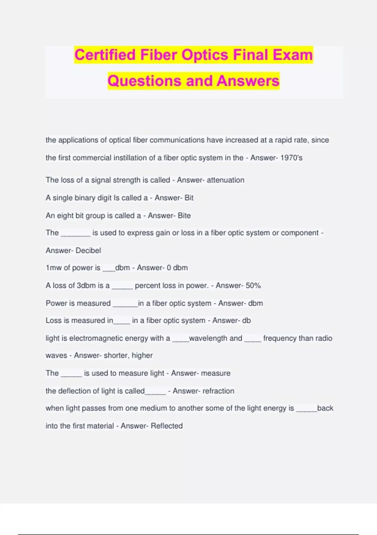 Certified Fiber Optics Final Exam Questions and Answers the applications of optical fiber communications have increased at a rapid rate, since the first commercial instillation of a fiber optic system in the - Answer- 1970's The loss of a signal strength is called - Answer- attenuation A single binary digit Is called a - Answer- Bit An eight bit group is called a - Answer- Bite The _______ is used to express gain or loss in a fiber optic system or component - Answer- Decibel 1mw of power is ___dbm - Answer- 0 dbm A loss of 3dbm is a _____ percent loss in power. - Answer- 50% Power is measured ______in a fiber optic system - Answer- dbm Loss is measured in____ in a fiber optic system - Answer- db light is electromagnetic energy with a ____wavelength and ____ frequency than radio waves - Answer- shorter, higher The _____ is used to measure light - Answer- measure the deflection of light is called_____ - Answer- refraction when light passes from one medium to another some of the light energy is _____back into the first material - Answer- Reflected The refractive index profile describes the relation between the indices of ____ and ______.The core of the multimode optical fiber has the highest refractive index. - Answer- Core, Cladding What makes up an optical fiber - Answer- core, cladding, coating mode is another name for - Answer- Path single mode fiber have a _____core than multimode fibers - Answer- smaller the part of the multimode optical fiber that functions as a mode filter is the______ - Answer- cladding The standard core diameters of multimode fiber are___ and ___um. - Answer- 50nm, 62.5 _______strength is the ability of a fiber to be stretched or pulled without breaking - Answer- Tensile The Tensile strength of a fiber is_______ when it is bent - Answer- Refracted The number of modes in an optical fiber decreases as the ___increases - Answer- Wavelength Bandwidth is and effective indication of the rate at which____ can be sent - Answer- Intelligence Graded index fibers uses numerous concentric layers of glass to reduce______ - Answer- Modal Dispersion The number of modes in an optical fiber ____as the core diameter decreases - Answer- Decreases in accordance with the (ISO) (IEC) 1801 specifications, the___ was designed for use with OM1 and OM2 fibers - Answer- LED
