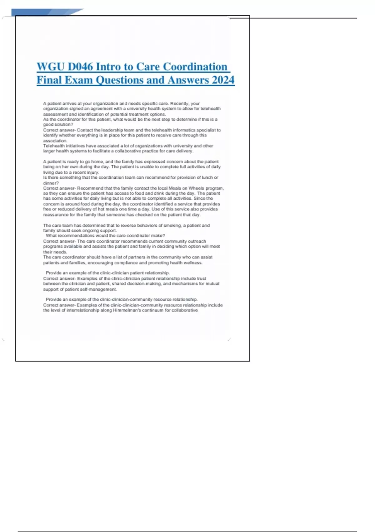 WGU D046 Intro to Care Coordination Final Exam Questions and Answers 2024