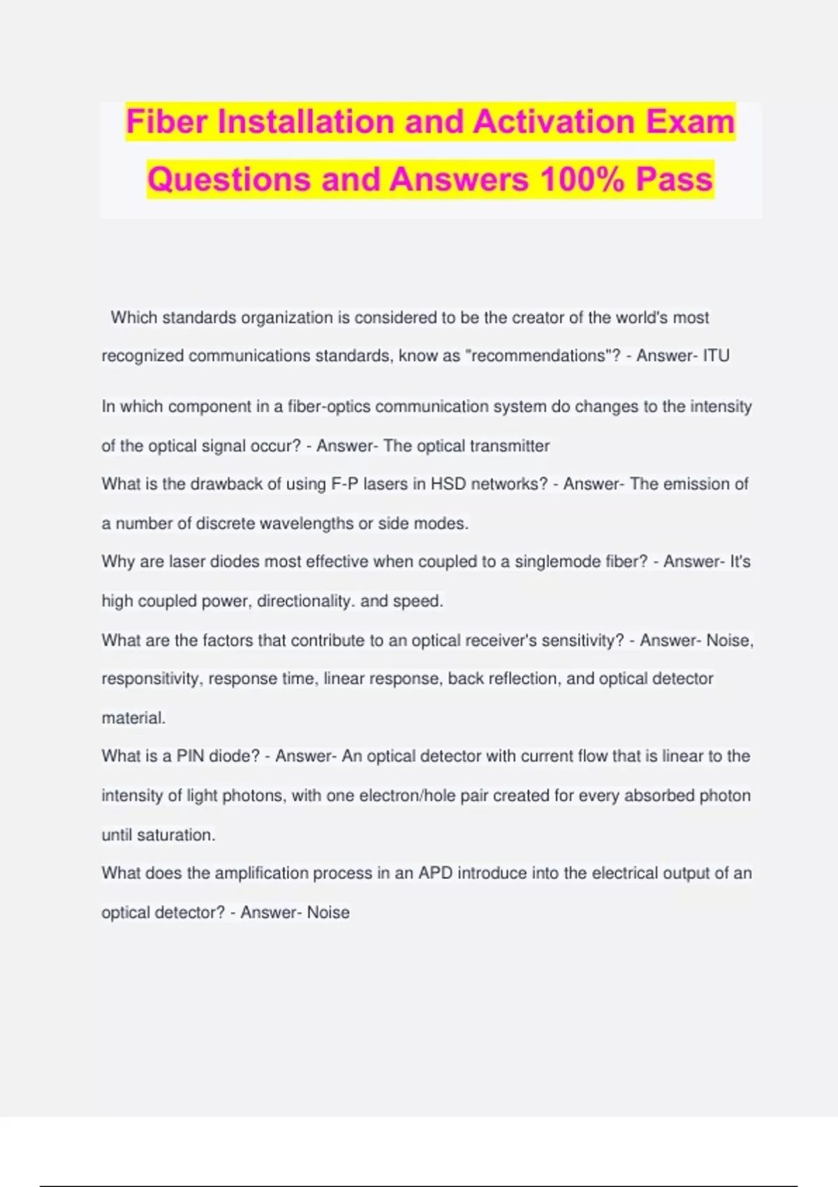 Fiber Installation and Activation Exam Questions and Answers 100% Pass Which standards organization is considered to be the creator of the world's most recognized communications standards, know as "recommendations"? - Answer- ITU In which component in a fiber-optics communication system do changes to the intensity of the optical signal occur? - Answer- The optical transmitter What is the drawback of using F-P lasers in HSD networks? - Answer- The emission of a number of discrete wavelengths or side modes. Why are laser diodes most effective when coupled to a singlemode fiber? - Answer- It's high coupled power, directionality. and speed. What are the factors that contribute to an optical receiver's sensitivity? - Answer- Noise, responsitivity, response time, linear response, back reflection, and optical detector material. What is a PIN diode? - Answer- An optical detector with current flow that is linear to the intensity of light photons, with one electron/hole pair created for every absorbed photon until saturation. What does the amplification process in an APD introduce into the electrical output of an optical detector? - Answer- Noise What functions does the detector in an optical receiver perform? - Answer- Conversion of an optical carrier to an electrical signal, and demodulation of the modulated optical carrier. What happens if the optical signal exceeds the maximum specified input power into a photodetector? - Answer- Nonlinear operation resulting in distortion, data errors, and signal loss. What is a characteristic of light in a laser beam? - Answer- The laser beam consists of a limited range of wavelengths (monochromatic), with all light waves in phase (coherent light). Monitoring the status of optical nodes - Answer- Involves the use of a node transponder that continuously monitors a number of critical functions. Digital return path transmissions - Answer- Use dense wavelength division multiplexing (DWDM) digital return transmitters in hub-to-headend architectures. What is channel bonding? - Answer- A 3.0 revision to Data Over Cable Service Interface Specification (DOCSIS) that significantly increases upstream and downstream transport data rates. What is MPEG? - Answer- A universally accepted standard for digital television, first released in 1992. Which of the following is true about optical nodes? - Answer- They contain four main sections: the optical reciever, the RF amplifier module, the reverse optical transmitter, and the DC power supply. What product based on the DOCSIS defines the protocols for IP telephony over HFC networks? - Answer- PacketCable In a centralized server VOD architecture, - Answer- The number of servers needed for video content storage is smaller than in distributed server architecture. Which of the following statements about local ad insertion is true? - Answer- Local ad insertion is performed usually by a video server. In regard to providing high-speed data (HSD) service, - Answer- The CMTS can provide a data transfer rate up to 38Mbps using 256-QAM in a single 6MHz channel. Which of the following is true about the SONET transmission standard? - Answer- SONET is the North American standard used for telephony applications. Why was the zero-dispersion point in single-mode fiber moved to 1,550 nm? - Answer- To take advantage of the low intrinsic absorption and lower attenuation at 1550nm single-mode fiber.