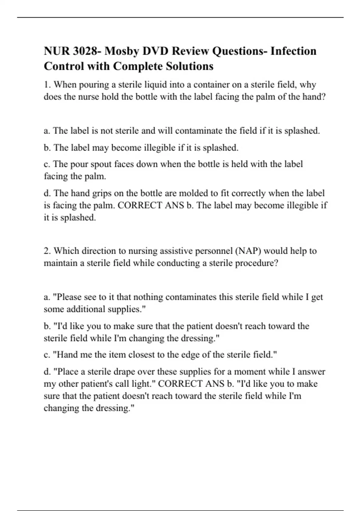 NUR 3028- Mosby DVD Review Questions- Infection Control with Complete Solutions