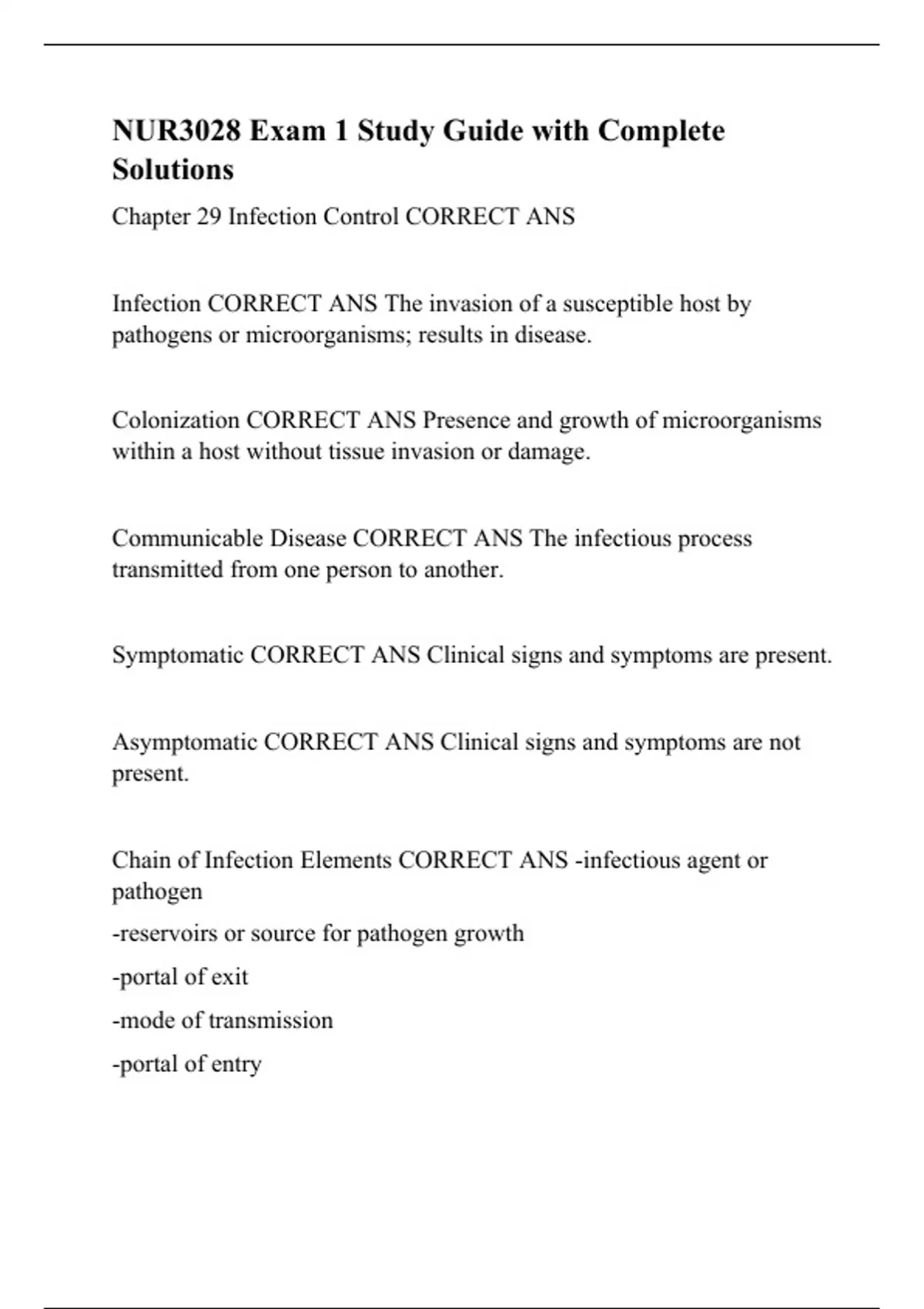 NUR3028 Exam 1 Study Guide with Complete Solutions.