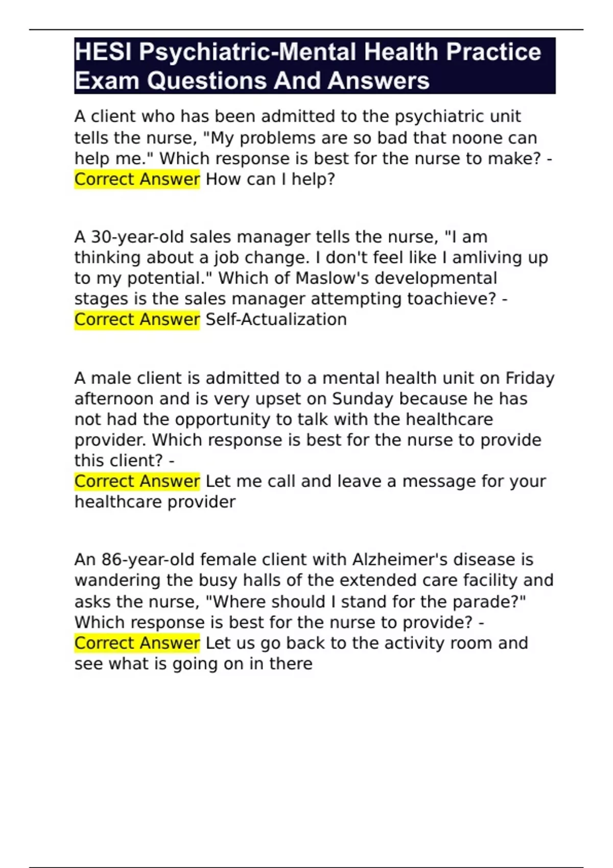 HESI Psychiatric-Mental Health Practice Exam Questions And Answers