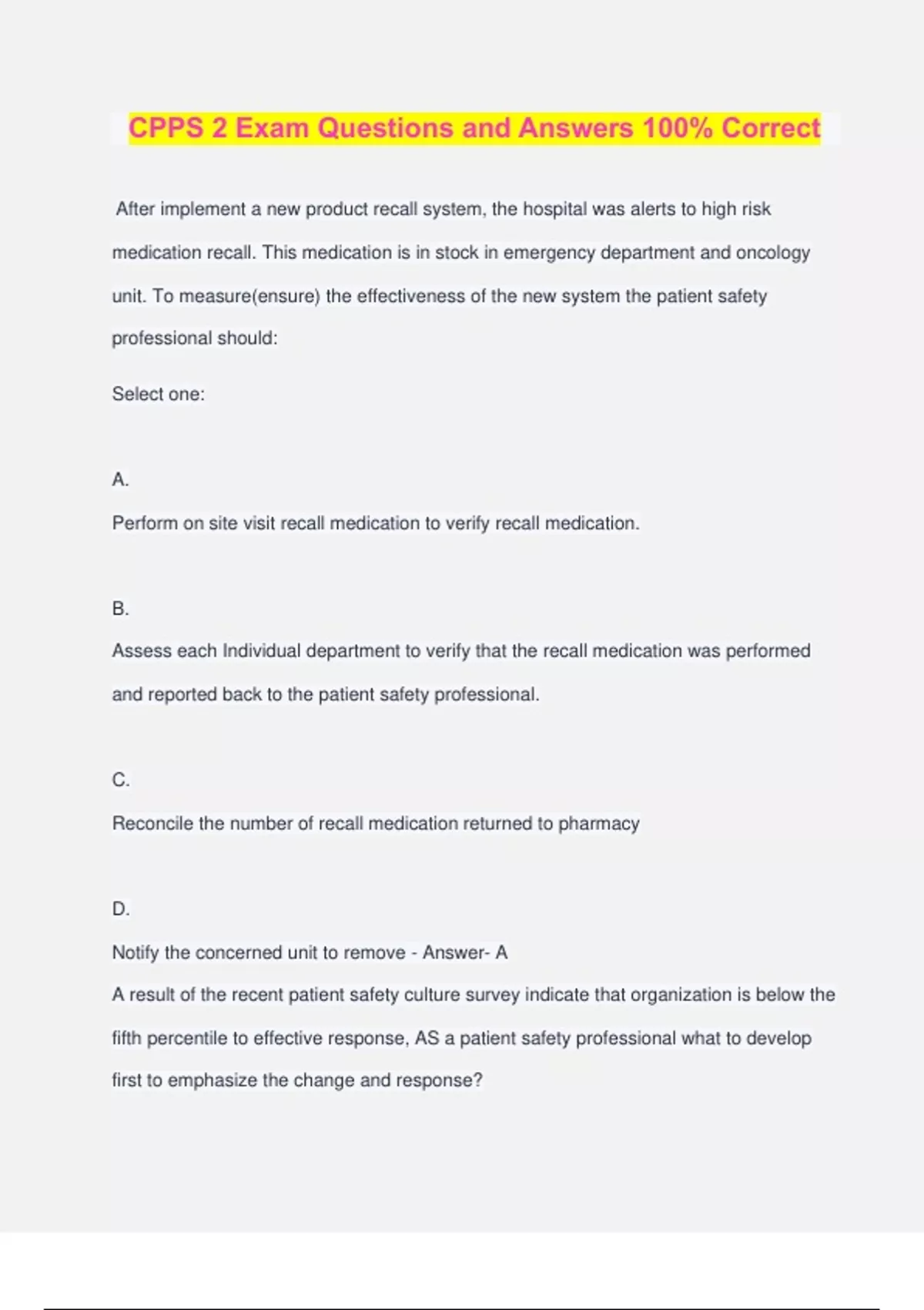 CPPS 2 Exam Questions and Answers 100% Correct After implement a new product recall system, the hospital was alerts to high risk medication recall. This medication is in stock in emergency department and oncology unit. To measure(ensure) the effectiveness of the new system the patient safety professional should: Select one: A. Perform on site visit recall medication to verify recall medication. B. Assess each Individual department to verify that the recall medication was performed and reported back to the patient safety professional. C. Reconcile the number of recall medication returned to pharmacy D. Notify the concerned unit to remove - Answer- A A result of the recent patient safety culture survey indicate that organization is below the fifth percentile to effective response, AS a patient safety professional what to develop first to emphasize the change and response? Select one: A. Present the result to top management as a patient safety issues B. Analyze the result with leadership C. Staff training program and communication D. Conduct monthly LD walk round - Answer- A Dr. Thomas is reviewing data from the surgical ICU's recent administration of AHRQ's Hospital Survey on Patient Safety Culture. He notices that the "teamwork within unit" results demonstrate a consistency with issues the unit's staff have discussed with him. Dr. Thomas can best use these data for which of the following? Select one: A. Raising staff awareness to importance of reporting. B. Assessing staff attitudes toward teamwork. C. Identifying quality and safety improvement needs. D. Evaluating staff engagement in quality improvement efforts. Clear my choice - Answer- A One of the most common errors in systems thinking is: Select one: A. An inability to break the system elements into department-specific elements. B. The tendency to foster greater interdependence than anyone can master. C. Failing to predict unintended consequences of changing a system element. D. Neglecting to use technological advancements to their full potential. - Answer- A Different regulatory agents play important Efforts to improve patient safety and the quality of health care delivery through development and dissemination of information with respect to improve patient safety, such as recommendations, protocols, or information regarding best practices, the regulatory agent which consider Computerized Physician Order Entry as one of the three practices to improve medication Safety is: Select one: A. TJC. B. Leapfrogs. C. NQF. D. NPSF. - Answer- A A health center's patient and family advisory council completed a plan to improve the organization's patient-centered approach to care. Which of the following should the council include in their presentation to the Board/Leaders to demonstrate its value to the organization? Select one: A. Potential impact on outside resources. B. Moral obligation. C. Return on investment. D. Diversity of communication. - Answer- patient safety professional plans to use rapid cycles of change to test a process redesign. To evaluate each change, the professional should look for unintended consequences evidenced by: Select one: A. Correct execution of physician orders. B. Properly functioning parallel systems. C. Work-around being used to achieve a desired outcome. D. Appropriate supply utilization. - Answer- A patient safety professional plans to use rapid cycles of change to test a process redesign. To evaluate each change, the professional should look for unintended consequences evidenced by: Select one: A. Correct execution of physician orders. B. Properly functioning parallel systems. C. Work-around being used to achieve a desired outcome. D. Appropriate supply utilization - Answer- The correlation between the using of Computerized Physician Order Entry, CPOE and the frequency of administration errors can be descr