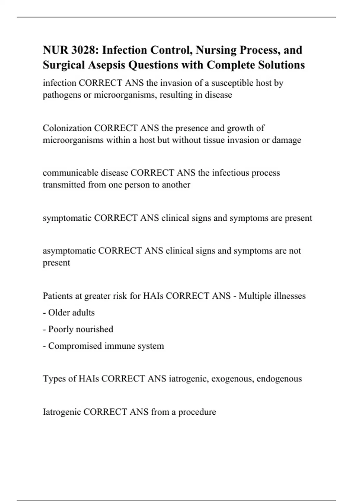 NUR 3028: Infection Control, Nursing Process, and Surgical Asepsis Questions with Complete Solutions