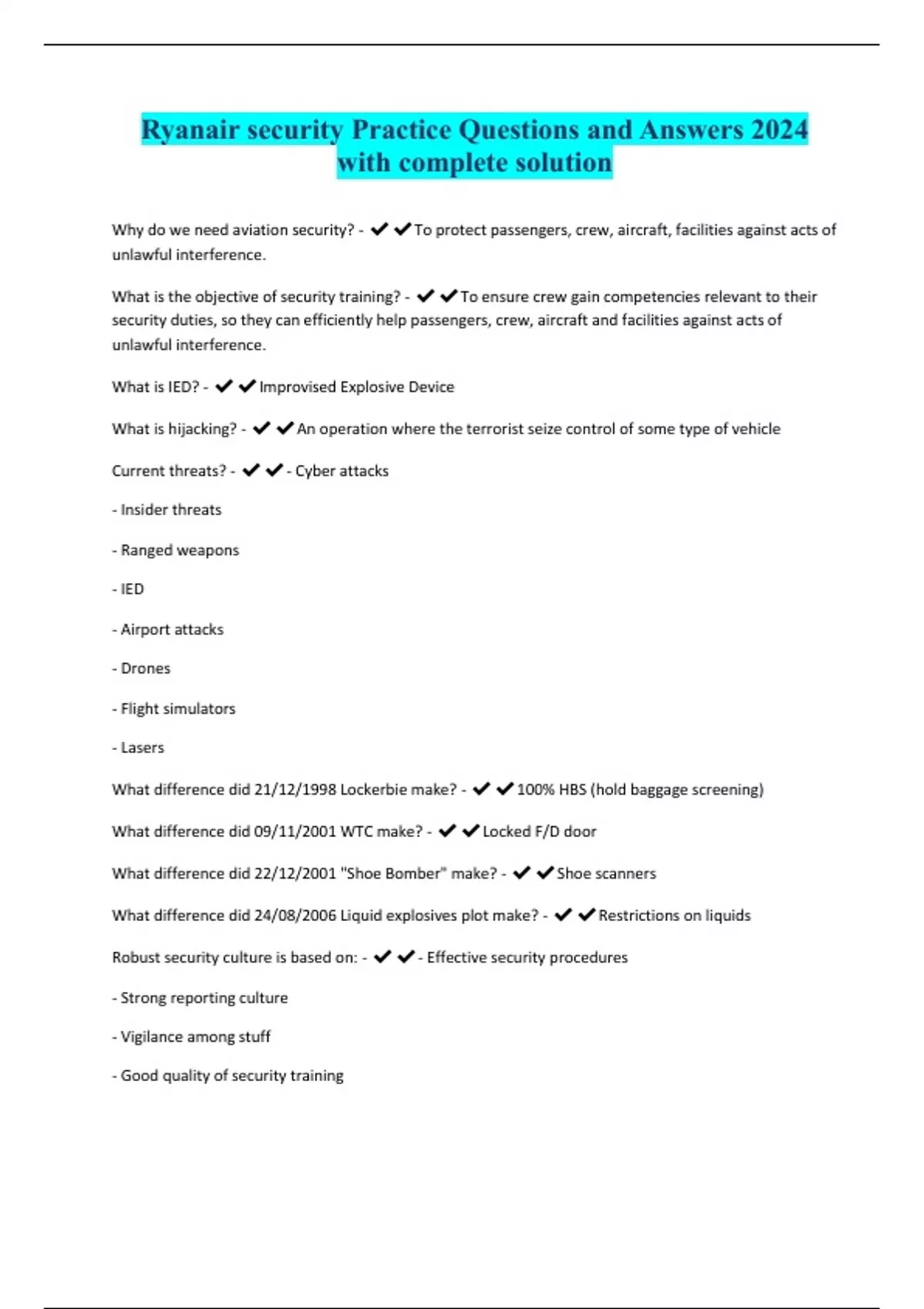 Ryanair security Practice Questions and Answers 2024 with complete solution Why do we need aviation security? - To protect passengers, crew, aircraft, facilities against acts of unlawful interference. What is the objective of security training? - To ensure crew gain competencies relevant to their security duties, so they can efficiently help passengers, crew, aircraft and facilities against acts of unlawful interference. What is IED? - Improvised Explosive Device What is hijacking? - An operation where the terrorist seize control of some type of vehicle Current threats? - - Cyber attacks - Insider threats - Ranged weapons - IED - Airport attacks - Drones - Flight simulators - Lasers What difference did 21/12/1998 Lockerbie make? -100% HBS (hold baggage screening) What difference did 09/11/2001 WTC make? - Locked F/D door What difference did 22/12/2001 "Shoe Bomber" make? - Shoe scanners What difference did 24/08/2006 Liquid explosives plot make? - Restrictions on liquids Robust security culture is based on: - - Effective security procedures - Strong reporting culture - Vigilance among stuff - Good quality of security training