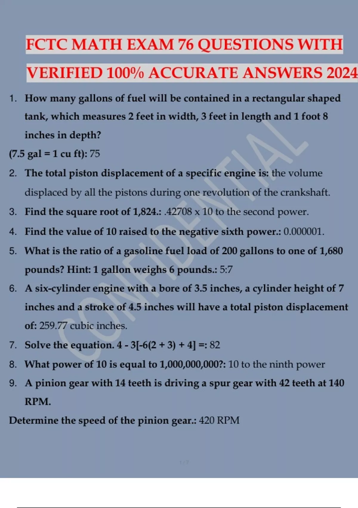 FCTC MATH WRITTEN EXAM 76 QUESTIONS WITH VERIFIED 100% ACCURATE ANSWERS 2024