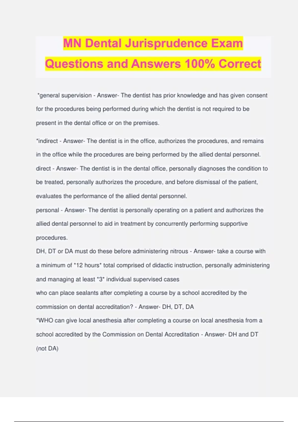 MN Dental Jurisprudence Exam Questions and Answers 100% Correct *general supervision - Answer- The dentist has prior knowledge and has given consent for the procedures being performed during which the dentist is not required to be present in the dental office or on the premises. *indirect - Answer- The dentist is in the office, authorizes the procedures, and remains in the office while the procedures are being performed by the allied dental personnel. direct - Answer- The dentist is in the dental office, personally diagnoses the condition to be treated, personally authorizes the procedure, and before dismissal of the patient, evaluates the performance of the allied dental personnel. personal - Answer- The dentist is personally operating on a patient and authorizes the allied dental personnel to aid in treatment by concurrently performing supportive procedures. DH, DT or DA must do these before administering nitrous - Answer- take a course with a minimum of *12 hours* total comprised of didactic instruction, personally administering and managing at least *3* individual supervised cases who can place sealants after completing a course by a school accredited by the commission on dental accreditation? - Answer- DH, DT, DA *WHO can give local anesthesia after completing a course on local anesthesia from a school accredited by the Commission on Dental Accreditation - Answer- DH and DT (not DA) *Dental hygienists and licensed dental assistants shall not take impressions and bite registrations for _____________ of fixed and removable prostheses. - Answer- Final construction *Before removal of bond material, a dental hygienist or licensed dental assistant must successfully complete a course in the use of ____________ for the express purpose of the removal of bond material from teeth. - Answer- rotary instruments *Scope of Practice* - Answer- --- DH and DA with restorative functions can place, contour, and adjust amalgam, glass ionomers, and stainless steel crowns on class _______ (supragingival) - Answer- Class I, II, V - a dental hygienist or dental assistant must successfully complete a board approved course on these specific restorative procedures. application of pit and fissure sealants - Answer- DH - general LDA - indirect *Administer LA - Answer- DH - general *monitor a patient on nitrous - Answer- DH - General LDA - Indirect T/F -- DH or LDA shall NOT take impressions and bite registrations for the FINAL construction of fixed and removable prostheses. - Answer- True *Utilizing rotary instruments for the removal of bond material from teeth - Answer- DH - indirect LDA - indirect Performing any or all restorative procedures limited to placing, contouring, & adjusting amalgam, glass ionomers, and Class I and V supra composite restorations - Answer- DH - indirect LDA - indirect *managing and removing IV lines - Answer- DH - indirect LDA - indirect *placing an IV line - Answer- DH - direct LDA - direct