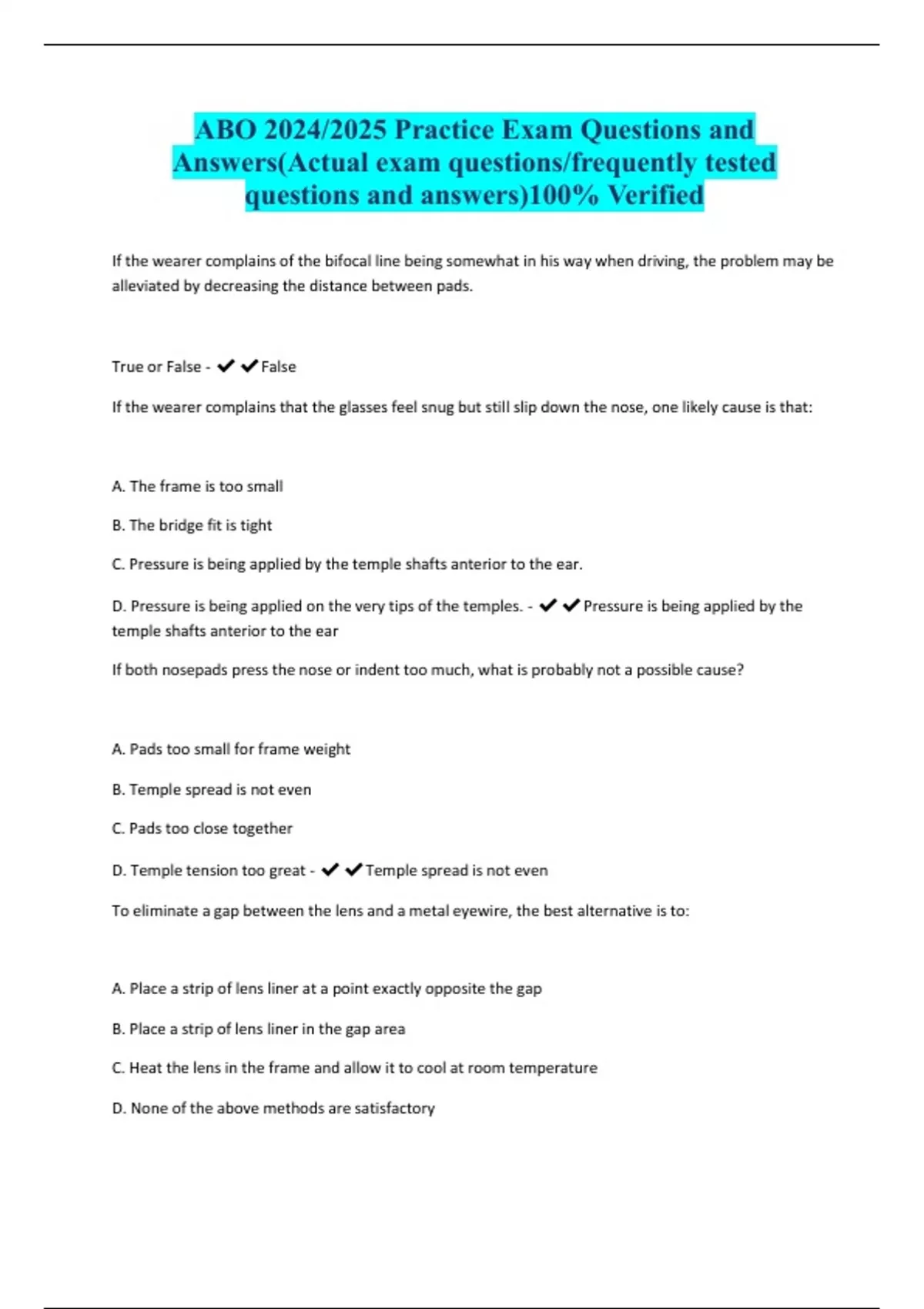 ABO 2024/2025 Practice Exam Questions and Answers(Actual exam questions/frequently tested questions and answers)100% Verified If the wearer complains of the bifocal line being somewhat in his way when driving, the problem may be alleviated by decreasing the distance between pads. True or False - False If the wearer complains that the glasses feel snug but still slip down the nose, one likely cause is that: A. The frame is too small B. The bridge fit is tight C. Pressure is being applied by the temple shafts anterior to the ear. D. Pressure is being applied on the very tips of the temples. - Pressure is being applied by the temple shafts anterior to the ear If both nosepads press the nose or indent too much, what is probably not a possible cause? A. Pads too small for frame weight B. Temple spread is not even C. Pads too close together D. Temple tension too great - Temple spread is not even To eliminate a gap between the lens and a metal eyewire, the best alternative is to: A. Place a strip of lens liner at a point exactly opposite the gap B. Place a strip of lens liner in the gap area C. Heat the lens in the frame and allow it to cool at room temperature D. None of the above methods are satisfactory