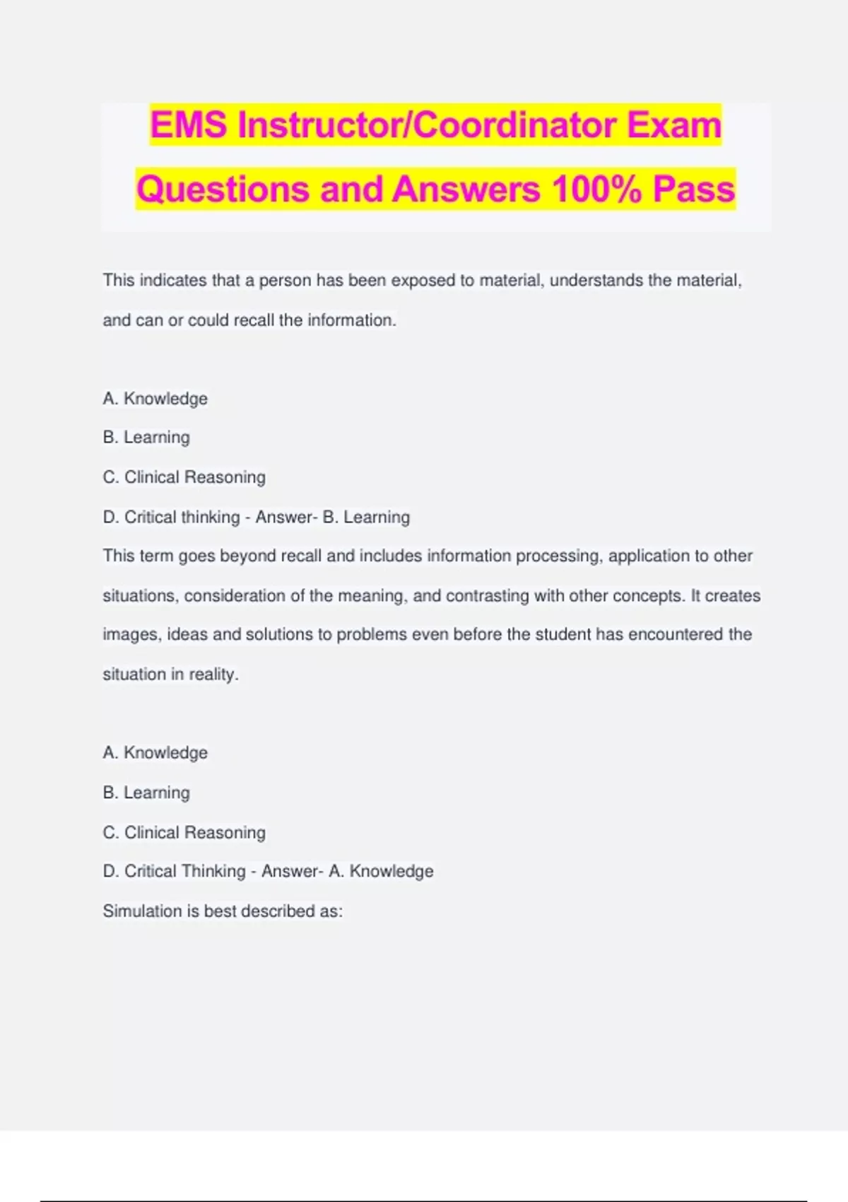 EMS Instructor/Coordinator Exam Questions and Answers 100% Pass This indicates that a person has been exposed to material, understands the material, and can or could recall the information. A. Knowledge B. Learning C. Clinical Reasoning D. Critical thinking - Answer- B. Learning This term goes beyond recall and includes information processing, application to other situations, consideration of the meaning, and contrasting with other concepts. It creates images, ideas and solutions to problems even before the student has encountered the situation in reality. A. Knowledge B. Learning C. Clinical Reasoning D. Critical Thinking - Answer- A. Knowledge Simulation is best described as: A.A high-fidelity manikin B. An instructional method C. Using sounds and smells during a scenario D. Fake blood - Answer- B. An instructional Method Which of the following is least likely to foster higher level thinking skills in students? A. Reading assignments B. Scenario-based simulation C. Case Studies D. Research presentations - Answer- A. Reading Assignments Which of the following best utilizes all three domains of learning? A. Reading assignments B. Simulations C. Lecture D. Workbooks - Answer- B. Simulations You are the primary instructor of an EMT lab course. A student comes to you and claims that a secondary instructor in the course, who commonly evaluates her, fails her because she is a woman. Which of the following is the student claiming the instructor is guilty of? A.Discrimination B. Harassment C. Sexual Harassment D. Libel - Answer- A. Discrimination A student claims that you did not teach him sterile technique when starting an IV. During clinical time the student caused an infection as a result. Which of the following elements of negligence is the student claiming you violated? A.Duty to Act B. Causation C. Breach of duty D. Injury - Answer- C. Breach of Duty Which of the following is the best way to avoid litigation in EMS education. A. Always abide by the syllabus. B. Never speak to students outside of class. C. Write your own policy and procedures. D. Follow all organizational and course policy and procedures. - Answer- D. Follow all organizational and course policy/procedures. You are the primary instructor for an EMT class of 40 students. Due to a computer issues, you are required to post grades on the door for the next two weeks. Which of the following would help you maintain student's academic privacy? A. Use only the student's last name on the posted paper. B. Break your organization's policy and do not post the grades C. You can use a random number that each student is assigned and place that number next to the grades. D. Privacy is not required unless it is a final grade - Answer- C. You can use a random number... The Family Education Rights Act of 1974 is also known as the: A.Ryan White Act B. Buckley Amendment C. Affordable Care Act D. Americans with Disabilities Act - Answer- B. Buckley Amendment You are primary instructor for a paramedic course at a college. About half way through the course a student advises you that he has a learning disability and is failing because he has trouble reading the test. Which of the following is the best course of action at this point? A. Tell the student there is nothing you can do at this point because he didn't tell you this at the beginning of the course. B. Immediately give the student a reader for all subsequent exams. C. Tell the student to have his doctor call you for proof. D. Follow your organization's policy regarding learning disabilities. - Answer- D. Follow your organizations policies/procedures.... You are mentoring a fellow instructor in a paramedic program. He has just begun teaching a cardiology class. The instructor states he found a lecture series from an instructor at a nearby college. He states he just plays the lectures during class. When you question the legality of this he states, "it was on the internet and didn't have the copyright symbol on it so it's free to use." Which of the following is most accurate?