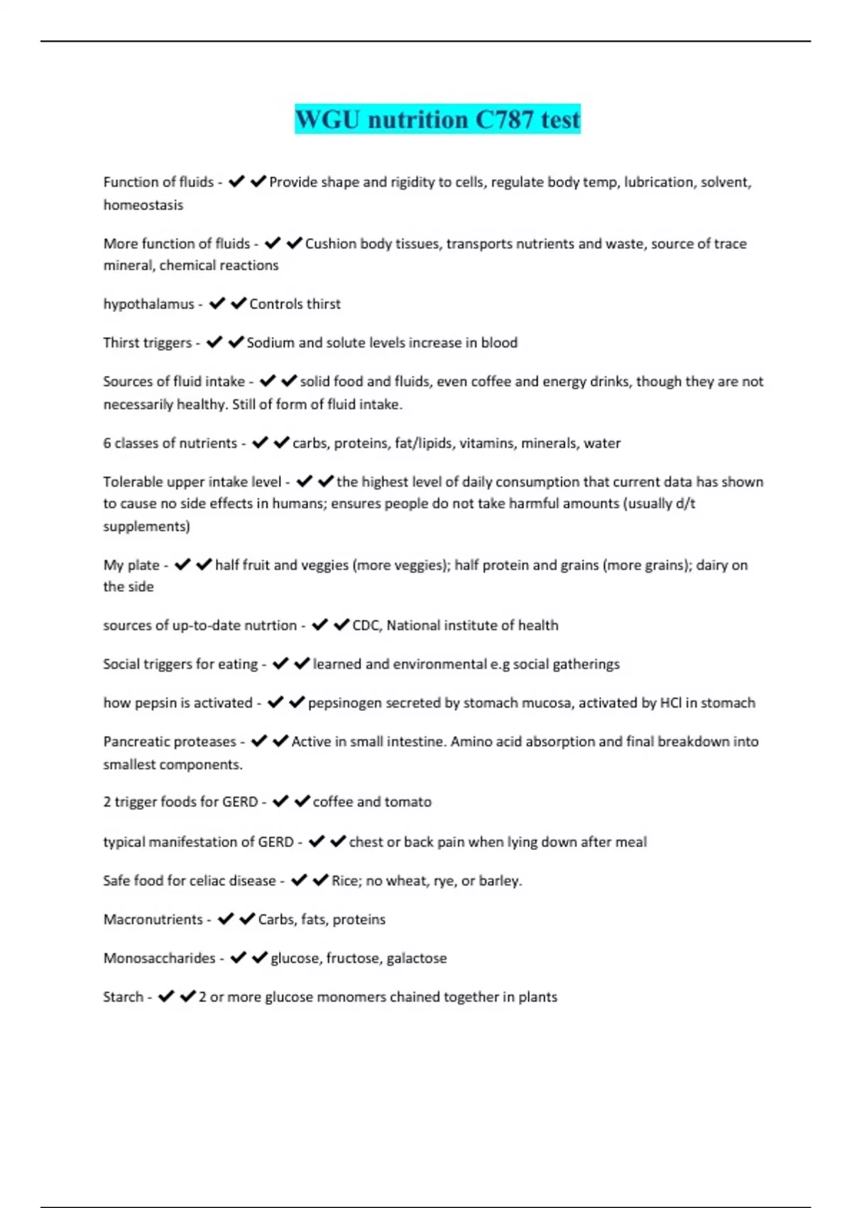 WGU nutrition C787 test Function of fluids - Provide shape and rigidity to cells, regulate body temp, lubrication, solvent, homeostasis More function of fluids - Cushion body tissues, transports nutrients and waste, source of trace mineral, chemical reactions hypothalamus - Controls thirst Thirst triggers - Sodium and solute levels increase in blood Sources of fluid intake - solid food and fluids, even coffee and energy drinks, though they are not necessarily healthy. Still of form of fluid intake. 6 classes of nutrients - carbs, proteins, fat/lipids, vitamins, minerals, water Tolerable upper intake level - the highest level of daily consumption that current data has shown to cause no side effects in humans; ensures people do not take harmful amounts (usually d/t supplements) My plate - half fruit and veggies (more veggies); half protein and grains (more grains); dairy on the side sources of up-to-date nutrtion - CDC, National institute of health Social triggers for eating - learned and environmental e.g social gatherings how pepsin is activated - pepsinogen secreted by stomach mucosa, activated by HCl in stomach Pancreatic proteases - Active in small intestine. Amino acid absorption and final breakdown into smallest components. 2 trigger foods for GERD - coffee and tomato typical manifestation of GERD - chest or back pain when lying down after meal Safe food for celiac disease - Rice; no wheat, rye, or barley. Macronutrients - Carbs, fats, proteins Monosaccharides - glucose, fructose, galactose Starch - 2 or more glucose monomers chained together in plants