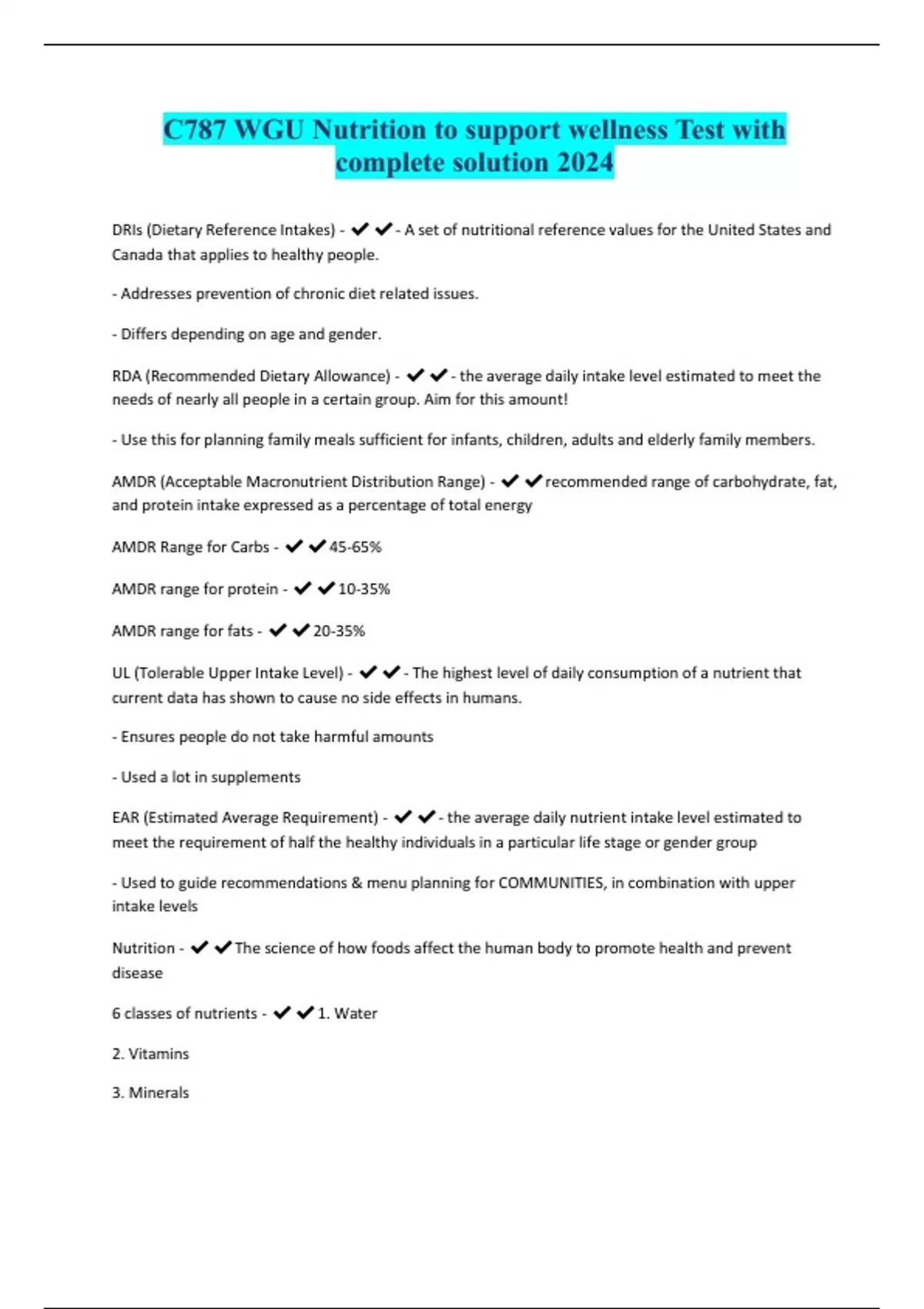 C787 WGU Nutrition to support wellness Test with complete solution 2024 DRIs (Dietary Reference Intakes) - - A set of nutritional reference values for the United States and Canada that applies to healthy people. - Addresses prevention of chronic diet related issues. - Differs depending on age and gender. RDA (Recommended Dietary Allowance) - - the average daily intake level estimated to meet the needs of nearly all people in a certain group. Aim for this amount! - Use this for planning family meals sufficient for infants, children, adults and elderly family members. AMDR (Acceptable Macronutrient Distribution Range) - recommended range of carbohydrate, fat, and protein intake expressed as a percentage of total energy AMDR Range for Carbs - 45-65% AMDR range for protein -10-35% AMDR range for fats - 20-35% UL (Tolerable Upper Intake Level) - - The highest level of daily consumption of a nutrient that current data has shown to cause no side effects in humans. - Ensures people do not take harmful amounts - Used a lot in supplements EAR (Estimated Average Requirement) - - the average daily nutrient intake level estimated to meet the requirement of half the healthy individuals in a particular life stage or gender group - Used to guide recommendations & menu planning for COMMUNITIES, in combination with upper intake levels Nutrition - The science of how foods affect the human body to promote health and prevent disease 6 classes of nutrients - 1. Water 2. Vitamins 3. Minerals