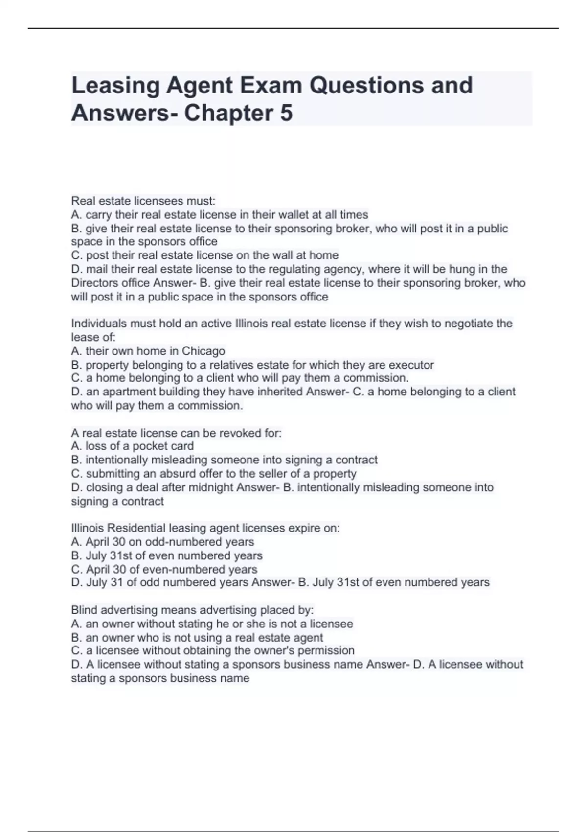 Leasing Agent Exam Questions and Answers- Chapter 5