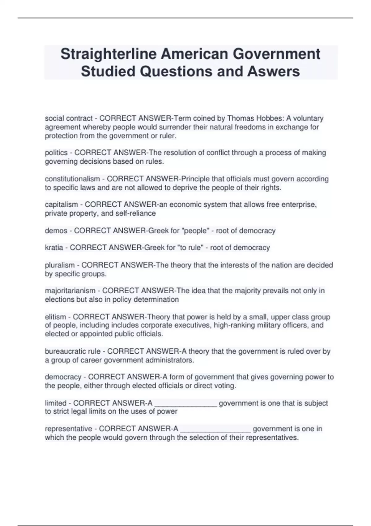 Straighterline American Government Studied Questions and Aswers social contract - CORRECT ANSWER-Term coined by Thomas Hobbes: A voluntary agreement whereby people would surrender their natural freedoms in exchange for protection from the government or ruler. politics - CORRECT ANSWER-The resolution of conflict through a process of making governing decisions based on rules. constitutionalism - CORRECT ANSWER-Principle that officials must govern according to specific laws and are not allowed to deprive the people of their rights. capitalism - CORRECT ANSWER-an economic system that allows free enterprise, private property, and self-reliance demos - CORRECT ANSWER-Greek for "people" - root of democracy kratia - CORRECT ANSWER-Greek for "to rule" - root of democracy pluralism - CORRECT ANSWER-The theory that the interests of the nation are decided by specific groups. majoritarianism - CORRECT ANSWER-The idea that the majority prevails not only in elections but also in policy determination elitism - CORRECT ANSWER-Theory that power is held by a small, upper class group of people, including includes corporate executives, high-ranking military officers, and elected or appointed public officials. bureaucratic rule - CORRECT ANSWER-A theory that the government is ruled over by a group of career government administrators. democracy - CORRECT ANSWER-A form of government that gives governing power to the people, either through elected officials or direct voting. limited - CORRECT ANSWER-A _______________ government is one that is subject to strict legal limits on the uses of power representative - CORRECT ANSWER-A _________________ government is one in which the people would govern through the selection of their representatives. John Locke - CORRECT ANSWER-When Thomas Jefferson penned "all men are created equal," in the Declaration of Independence, he was paraphrasing ___________________.