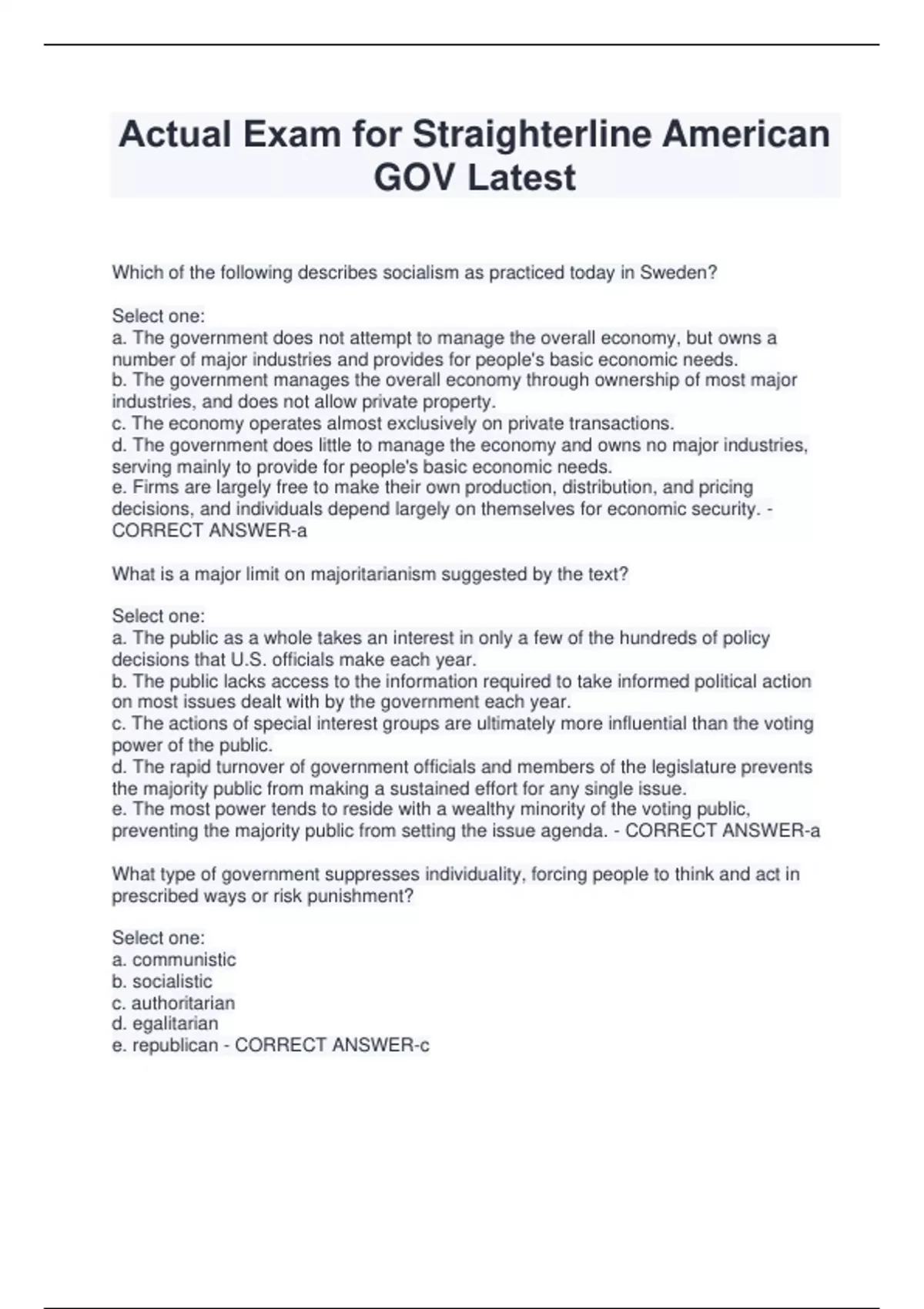 Actual Exam for Straighterline American GOV Latest Which of the following describes socialism as practiced today in Sweden? Select one: a. The government does not attempt to manage the overall economy, but owns a number of major industries and provides for people's basic economic needs. b. The government manages the overall economy through ownership of most major industries, and does not allow private property. c. The economy operates almost exclusively on private transactions. d. The government does little to manage the economy and owns no major industries, serving mainly to provide for people's basic economic needs. e. Firms are largely free to make their own production, distribution, and pricing decisions, and individuals depend largely on themselves for economic security. - CORRECT ANSWER-a What is a major limit on majoritarianism suggested by the text? Select one: a. The public as a whole takes an interest in only a few of the hundreds of policy decisions that U.S. officials make each year. b. The public lacks access to the information required to take informed political action on most issues dealt with by the government each year. c. The actions of special interest groups are ultimately more influential than the voting power of the public. d. The rapid turnover of government officials and members of the legislature prevents the majority public from making a sustained effort for any single issue. e. The most power tends to reside with a wealthy minority of the voting public, preventing the majority public from setting the issue agenda. - CORRECT ANSWER-a What type of government suppresses individuality, forcing people to think and act in prescribed ways or risk punishment? Select one: a. communistic b. socialistic c. authoritarian d. egalitarian e. republican - CORRECT ANSWER-c From 1945 until the late 1960s, there was the highest degree of bipartisanship in the area of: Select one: a. economic regulation. b. taxation levels. c. civil rights. d. foreign affairs. e. environmental policy. - CORRECT ANSWER-d