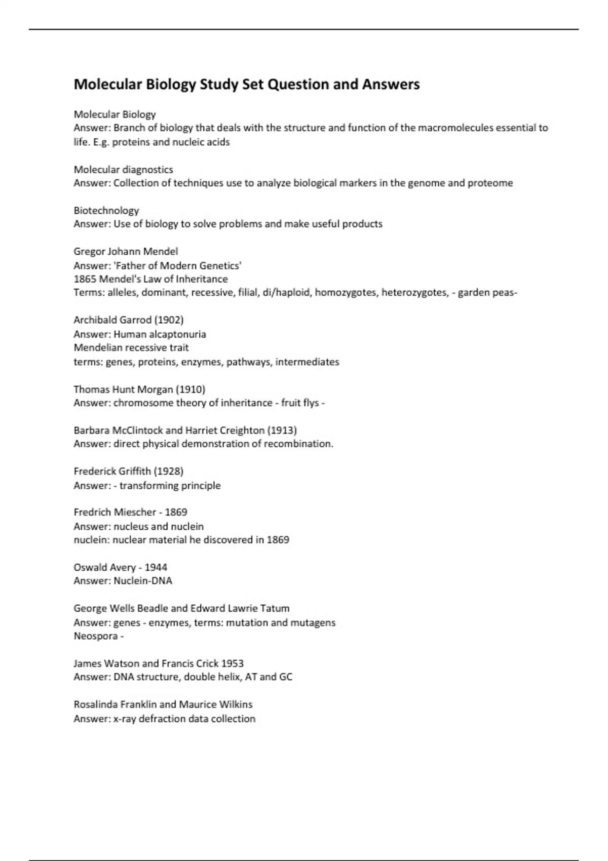 Molecular Biology Study Set Question and Answers
